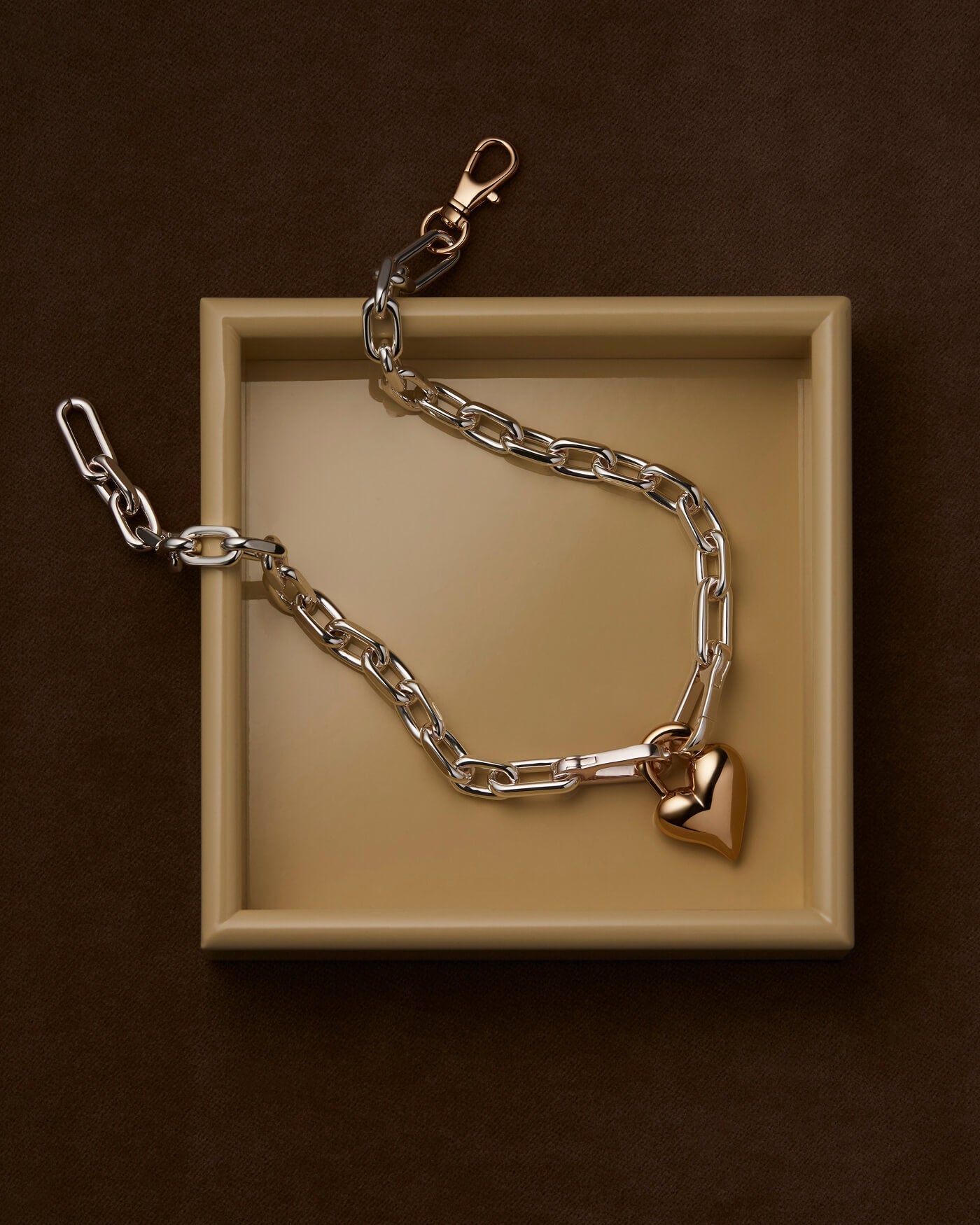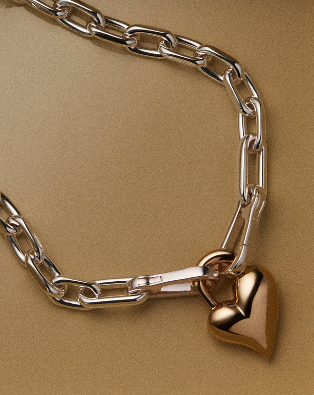A removable gold heart is hooked onto crisp, faceted silver links, creating a modern two-tone necklace. The chain can be split in half and used as a bag charm or keychain. Finished in high-polish gold and silver.