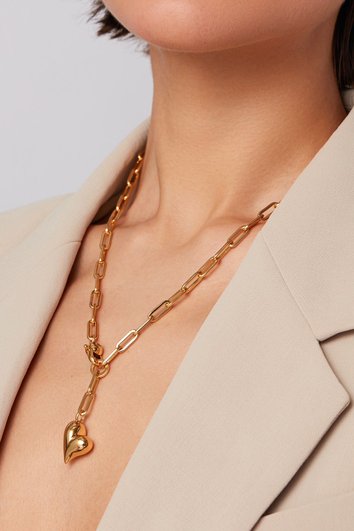 A joyful, inflated heart is suspended from a paperclip link chain necklace. Finished in high-polish gold.