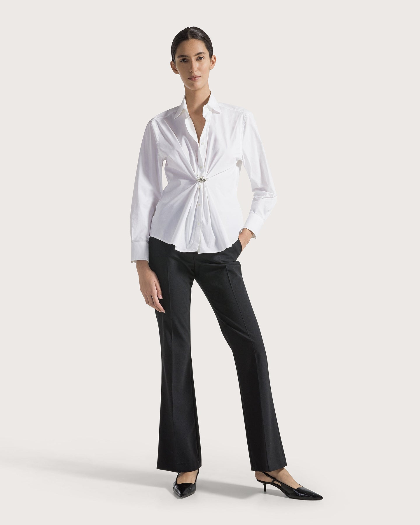 Long-sleeve poplin button-down shirt with gathering detail at waist and removable pin fastening.