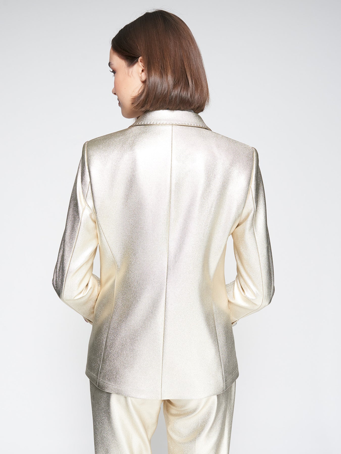 Gold blazer with shiny finish and straight silhouette. Features a classic notched lapel collar and one-button front closure. Two welt pockets on the front. The inner lining is printed. The sleeve cuffs are detailed with decorative bee buttons.
