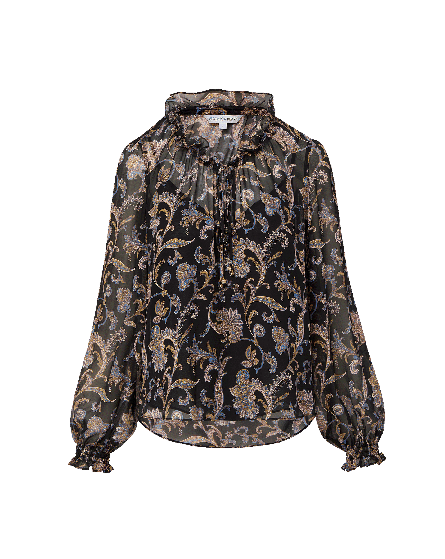 Bohemian chic. Made from light and airy washed silk georgette, the black Hickory blouse is defined by a custom paisley print in soft pink and blue. The relaxed silhouette and gently voluminous sleeves allow for ease while the flounce and decorative ruffles at the neck and cuffs add a romantic touch. Pair with wide-leg jeans for a dose of bohemian chic—this blouse is perfect for getaways and everyday.