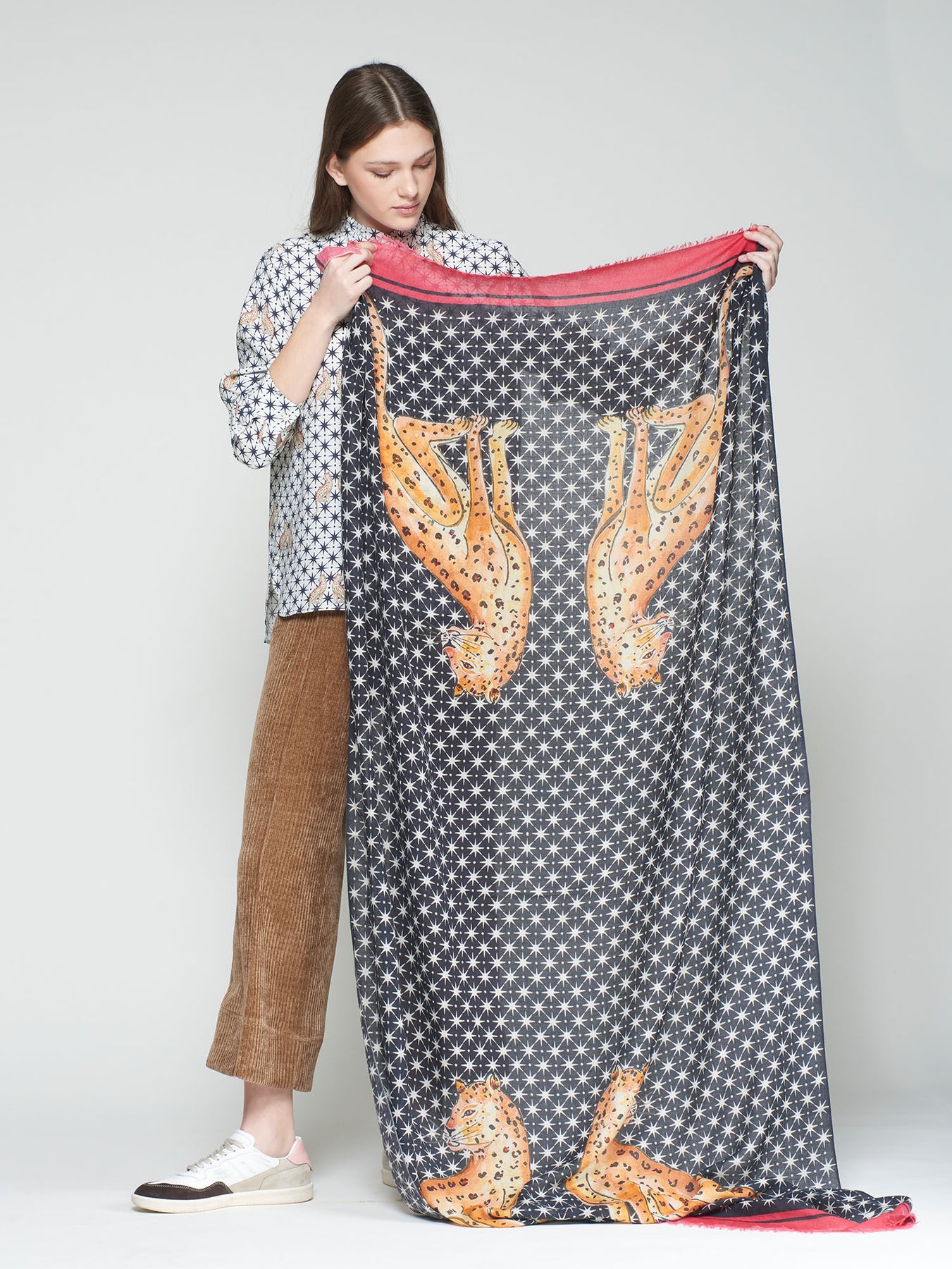 Rectangular foulard in dark blue with white stars and orange leopard motifs. Lightweight fabric with fringed edges. Cotton, modal and wool blend.