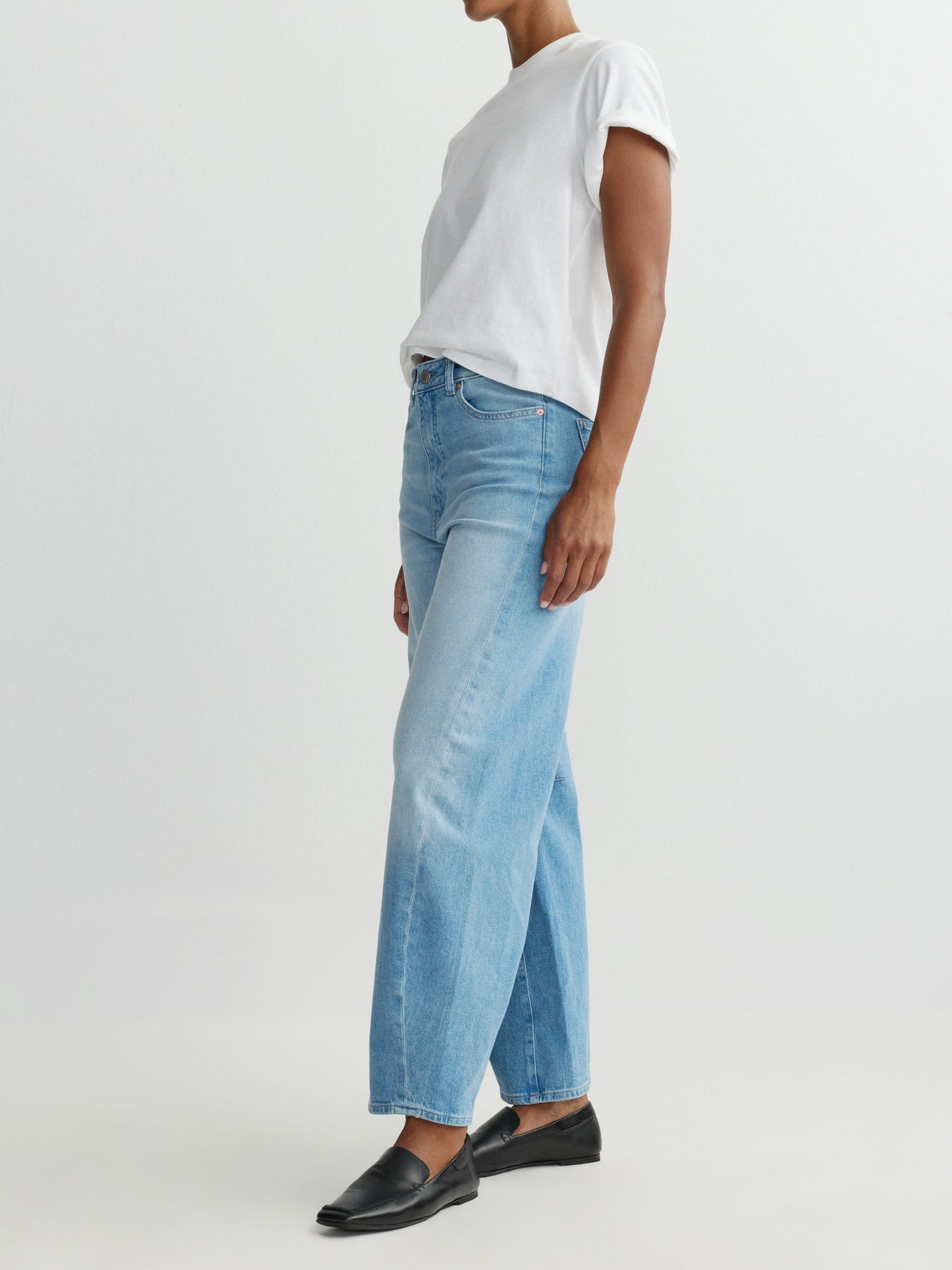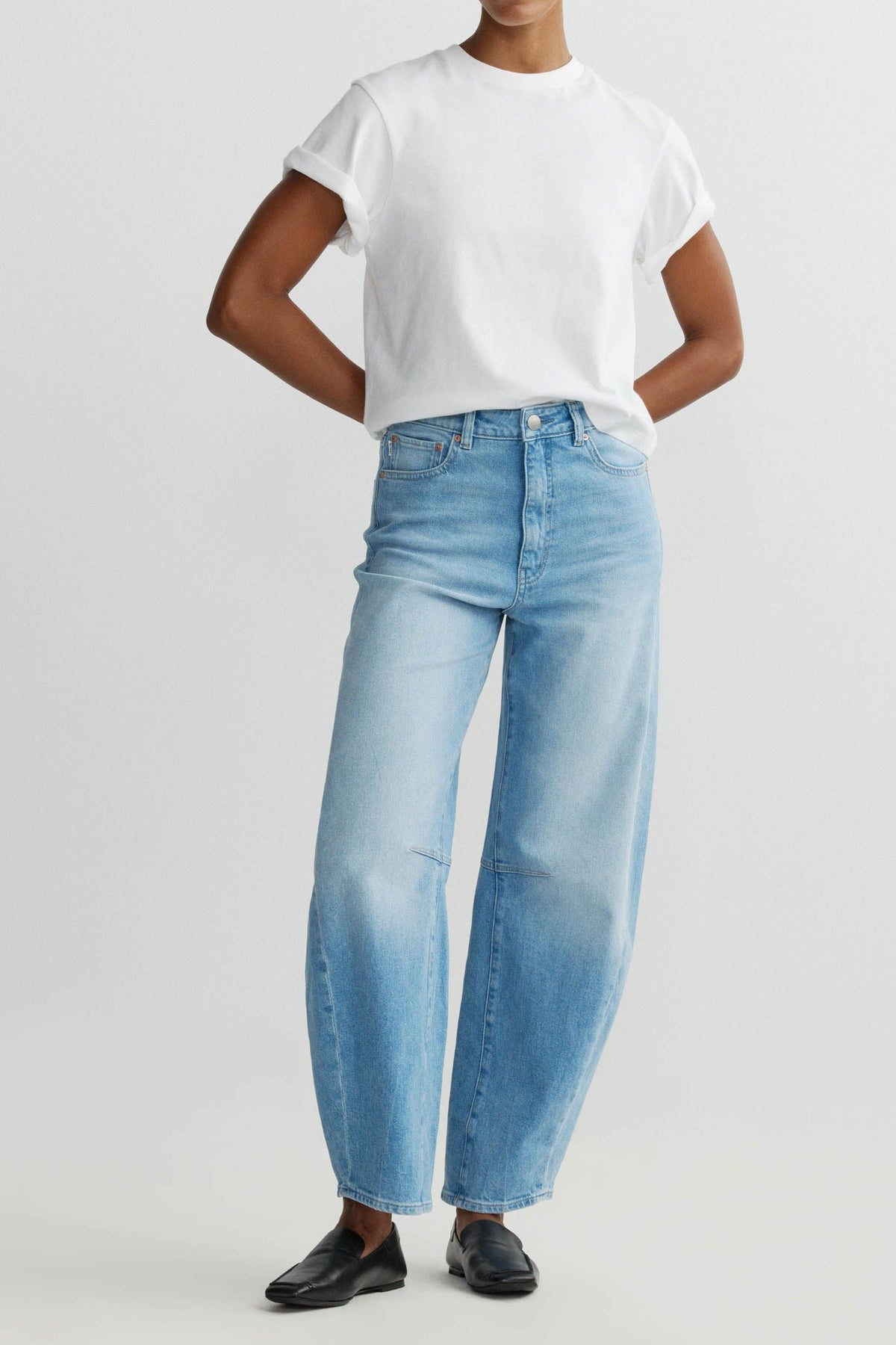 Miro is a high-rise, true barrel leg jean that is fitted at the hip with a 29" inseam, tapering at the leg.