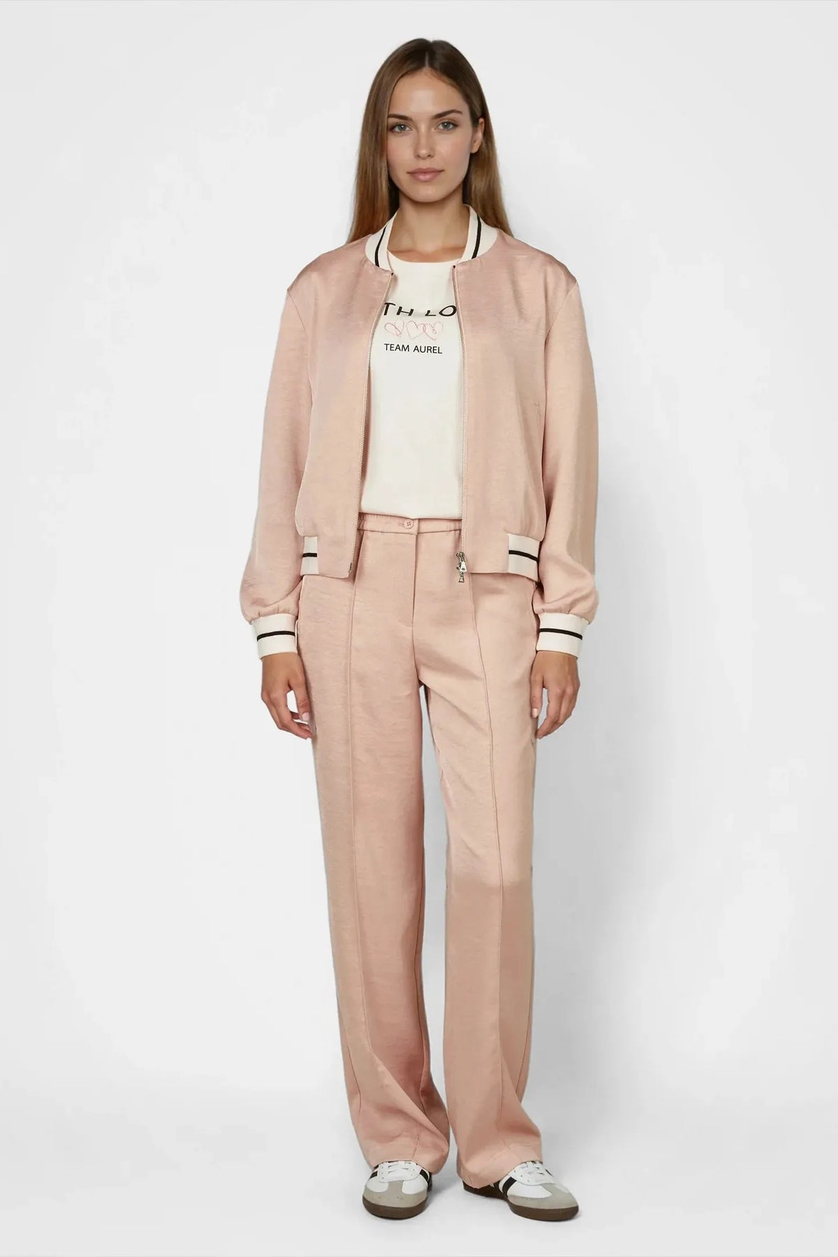 These pants feature a modern cut and soft twill fabric that creates a flowing silhouette. The elastic jogger cuffs and practical side pockets combine comfort with functionality. Quilted piping adds subtle accents and gives the look extra structure. Perfect for a fashionable appearance.