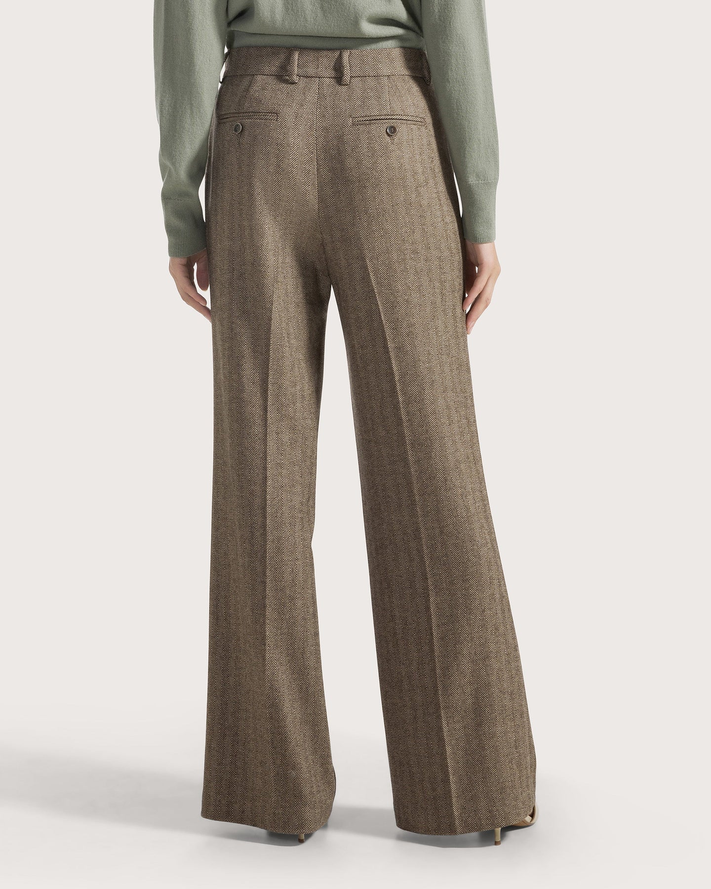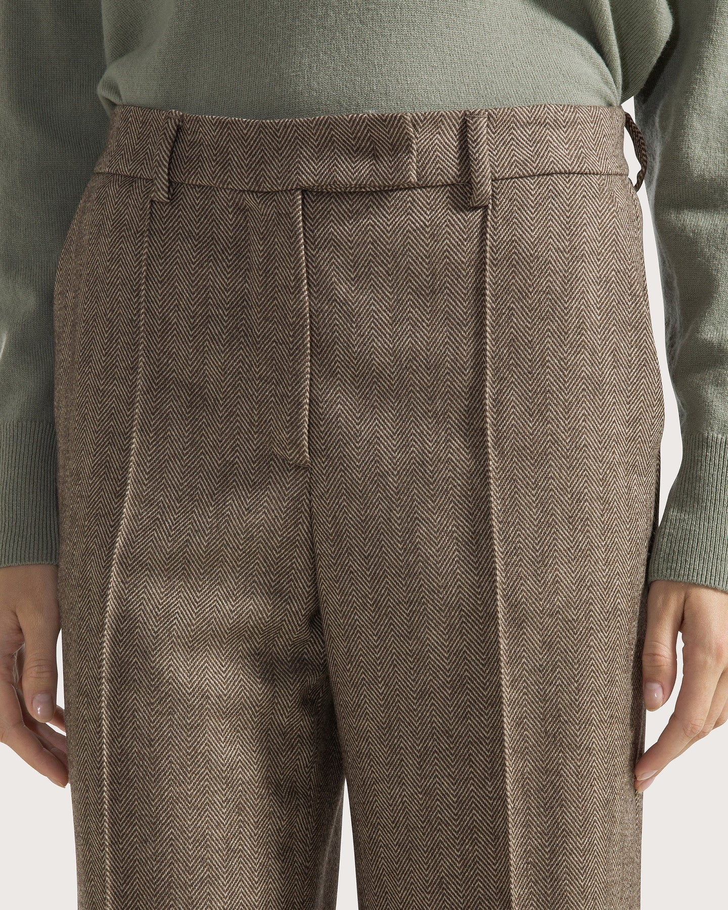 Straight-leg stretch blended wool pants with centre seam, side hook-and-button fastening. Waist loops, back welt pockets with button.