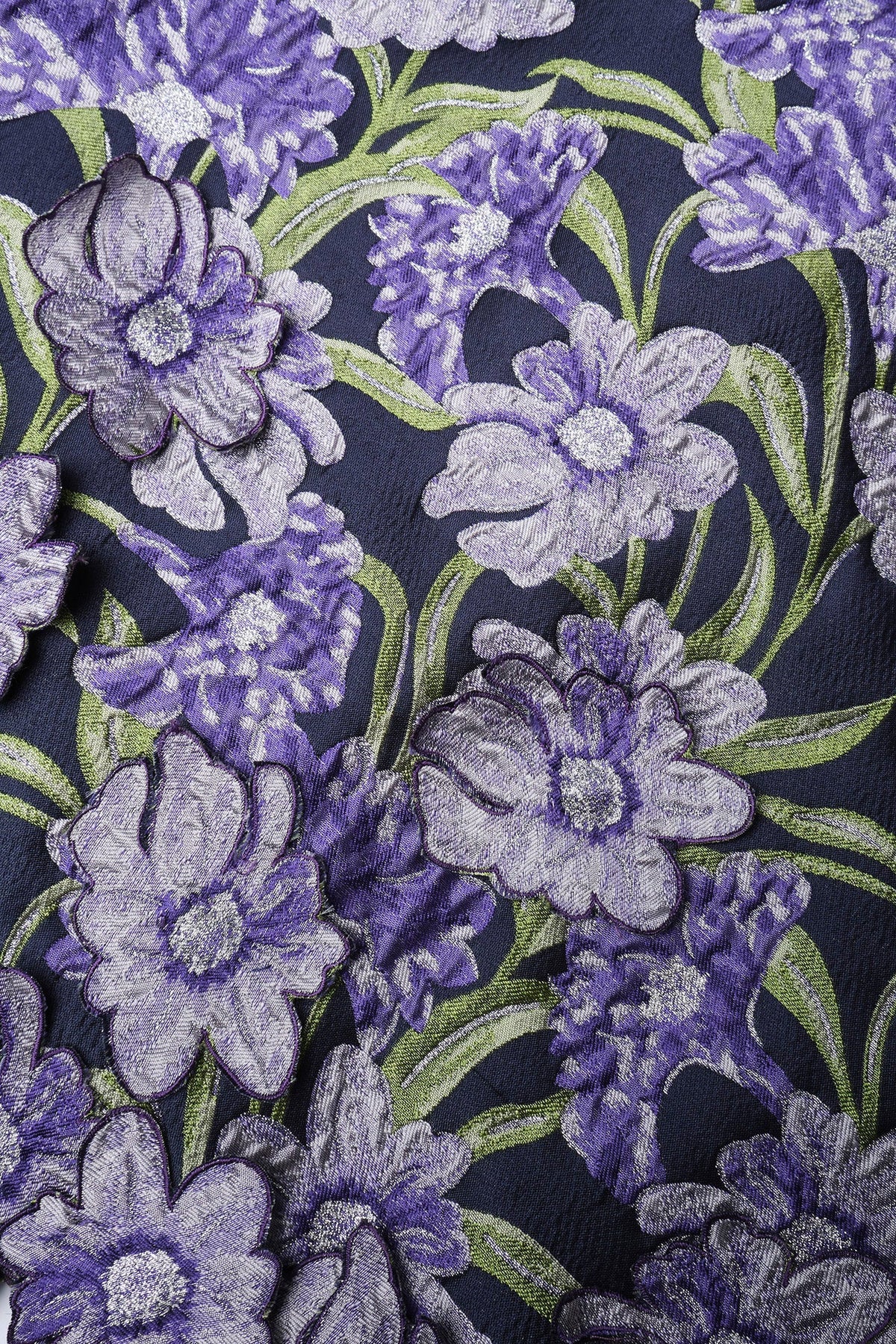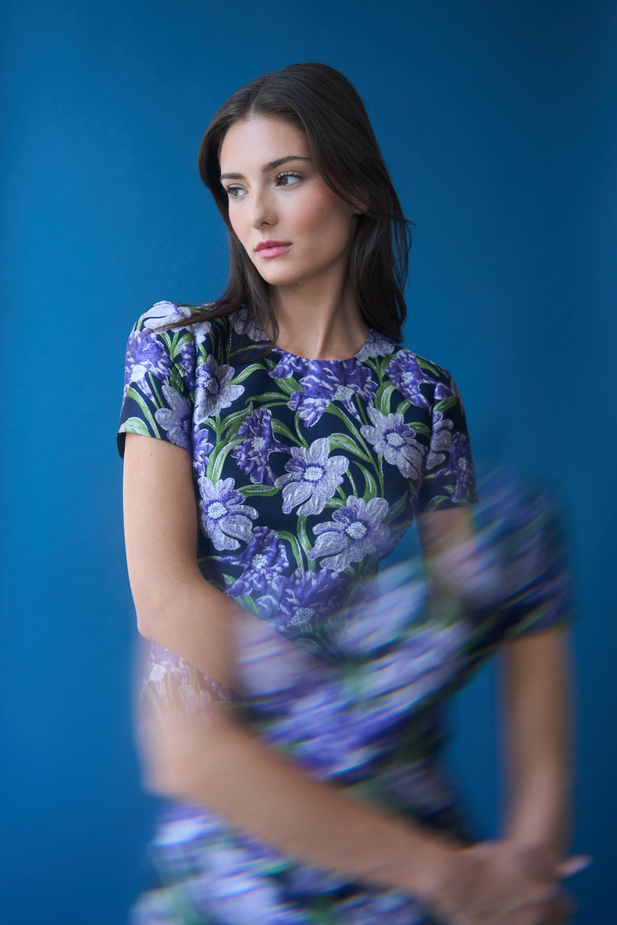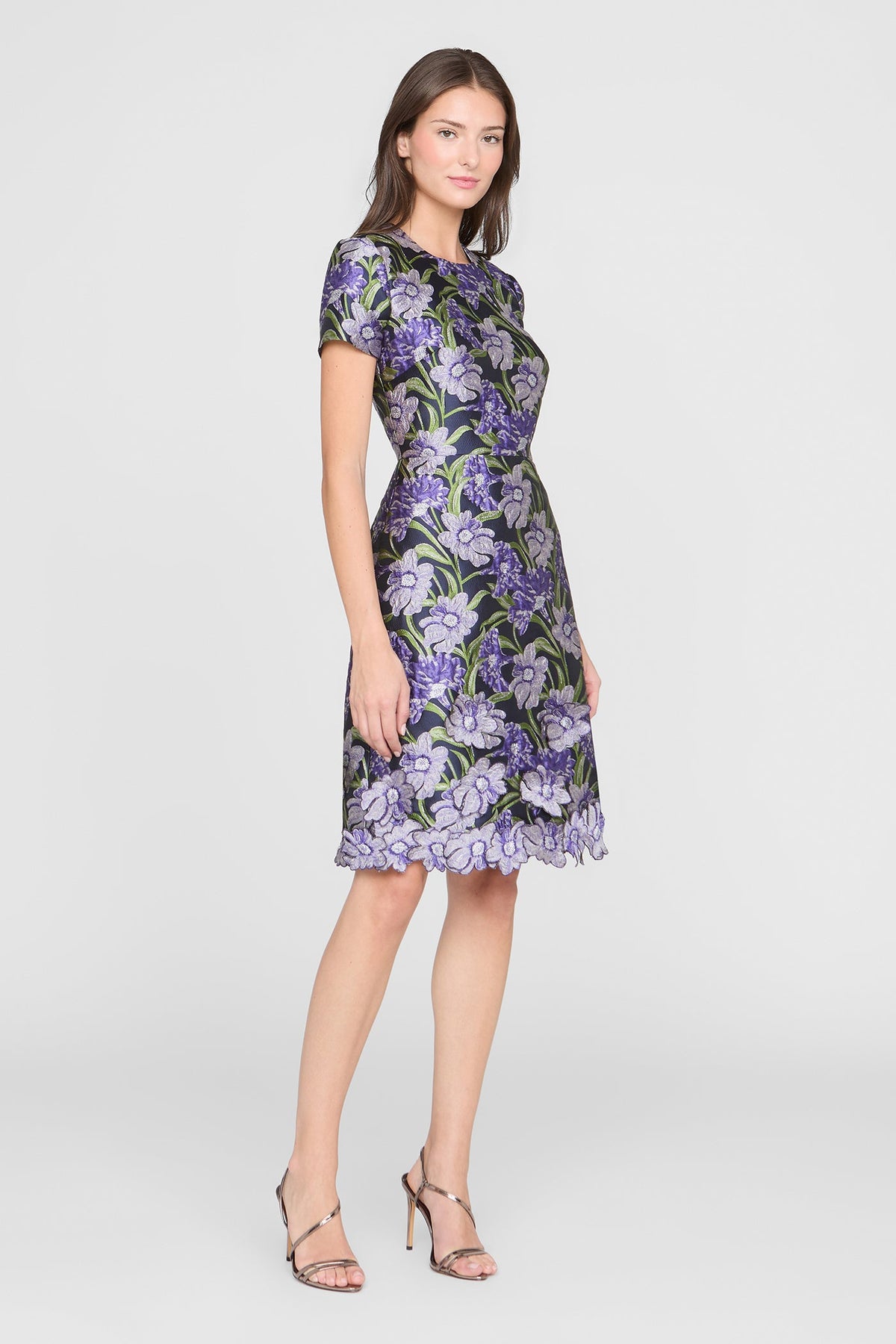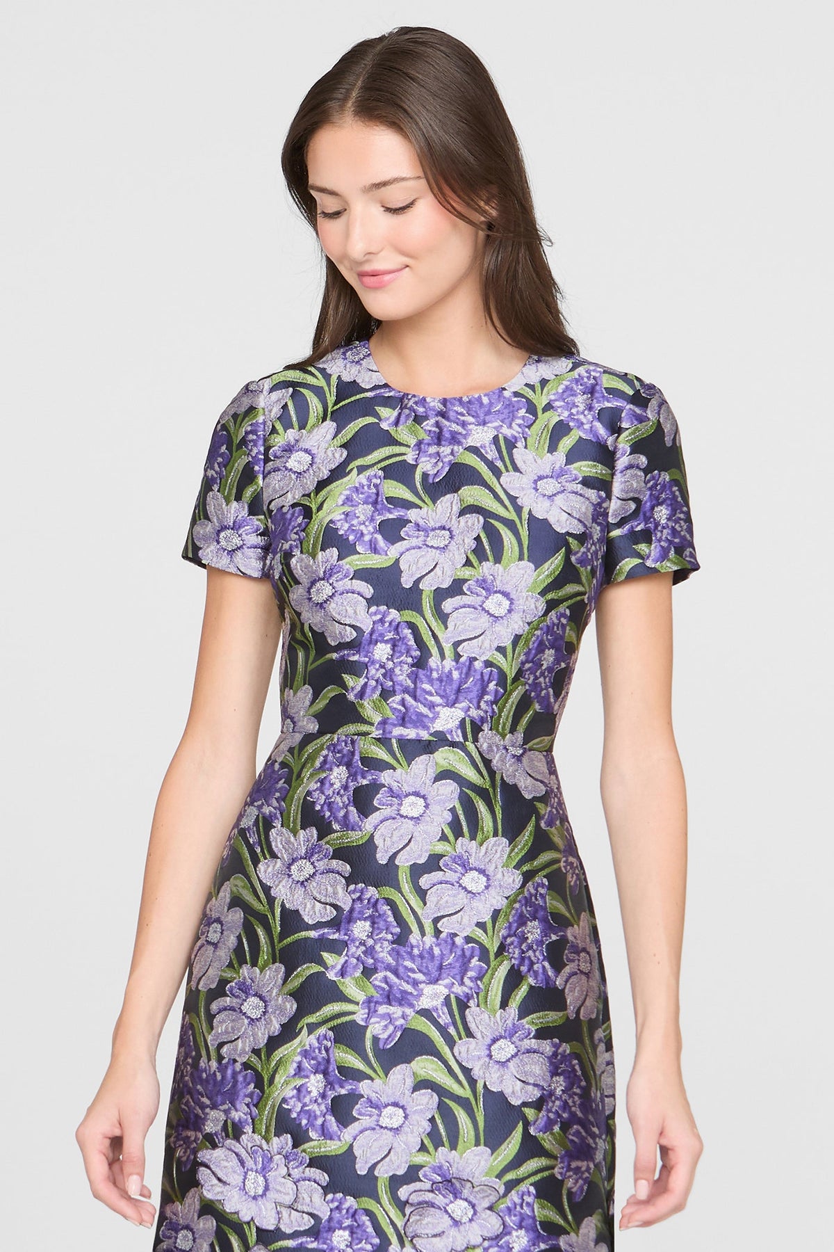 Floral jacquard dress with intricate cut-and-appliqué detailing that highlights the motifs. Finished with dimensional 3D florals and a clean short-sleeve option. A refined pick for luncheons and polished daytime occasions.