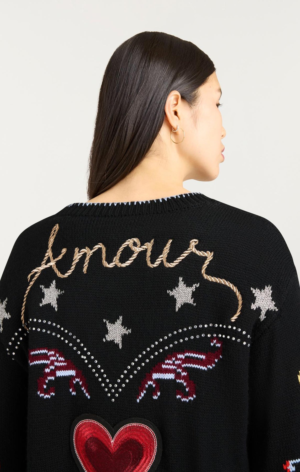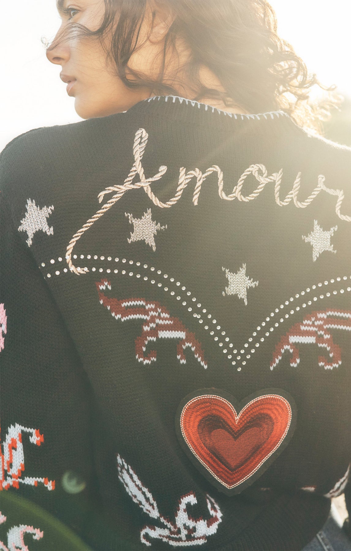 The Western Collage Cardigan is a refined statement piece featuring colorful designs of hearts, flowers, and the word "amour". The vibrant autumn hues of these designs, enhanced with subtle blue stitch detailing, boasts a striking artistic flair that makes this a distinctive addition to any wardrobe.