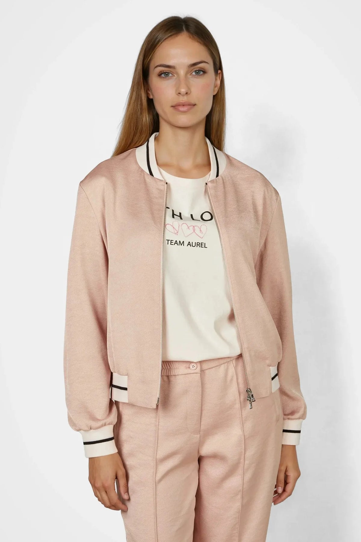 This blouson combines softly draping twill with a subtle sheen and sporty knit elements with contrasting stripes. Piped pockets create clean lines, while the bomber jacket collar emphasizes the sporty character. Ideal for a fashionable yet elegant look.