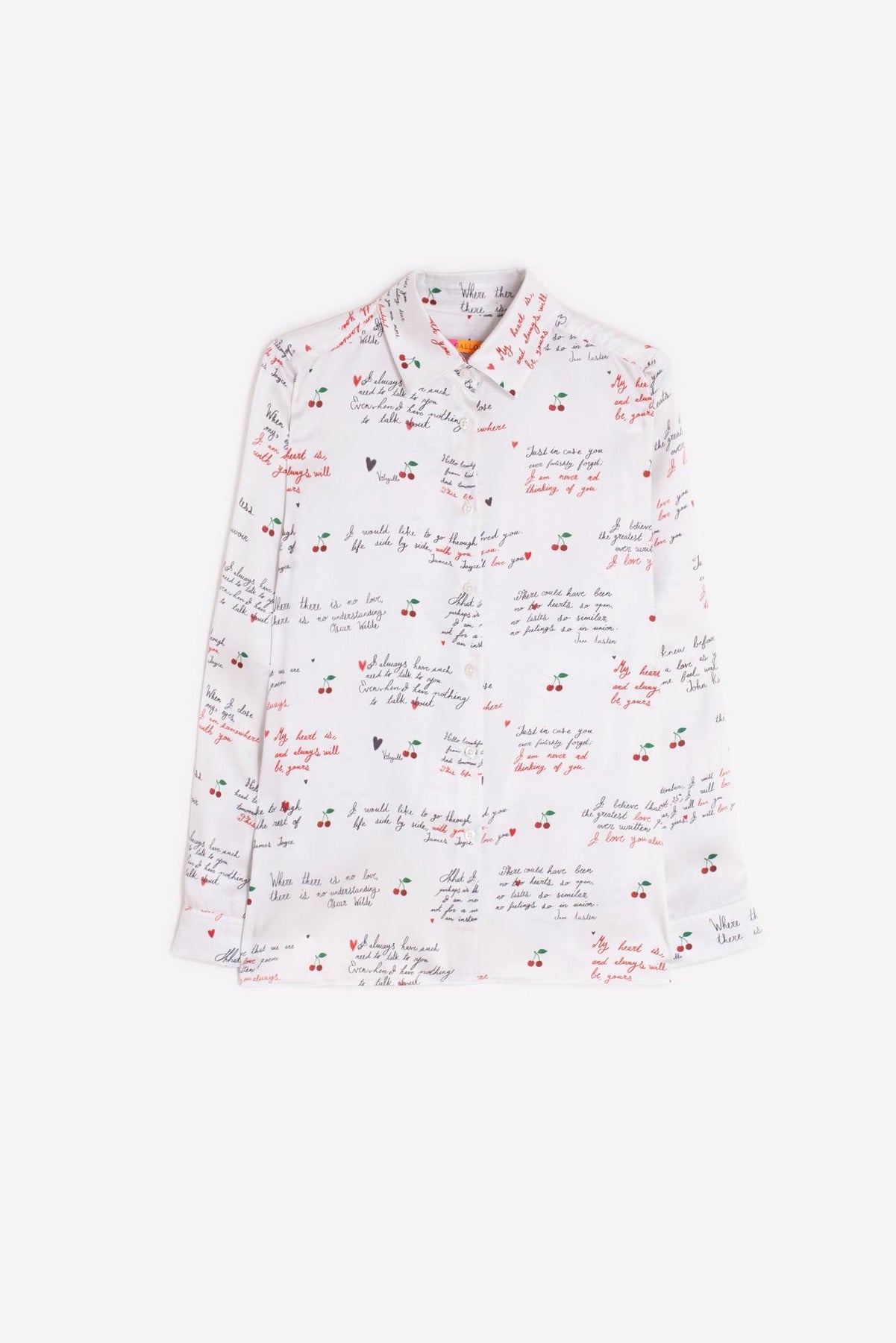 White straight-cut shirt with an original print of handwritten love phrases and small cherries scattered throughout the fabric. Classic shirt collar, visible button closure, and plain cuffs. The fabric is soft and fluid with a smooth finish.