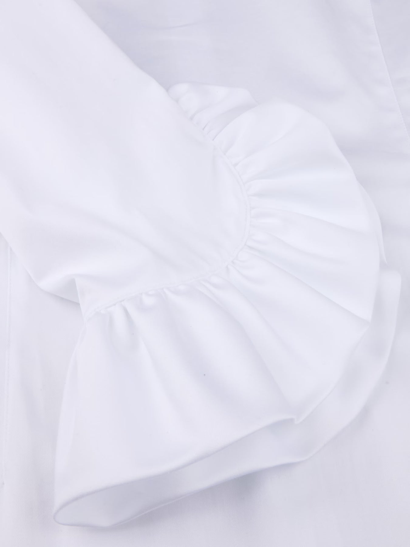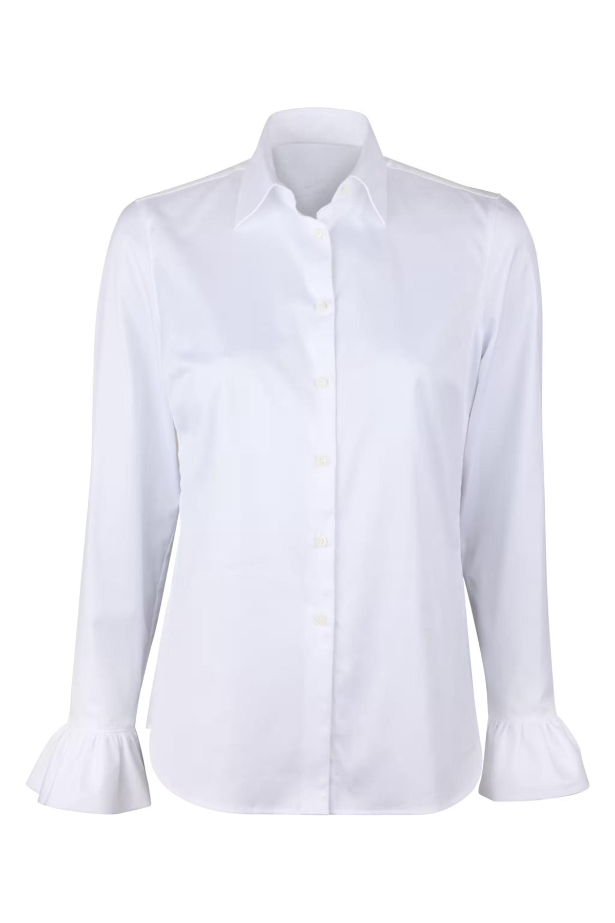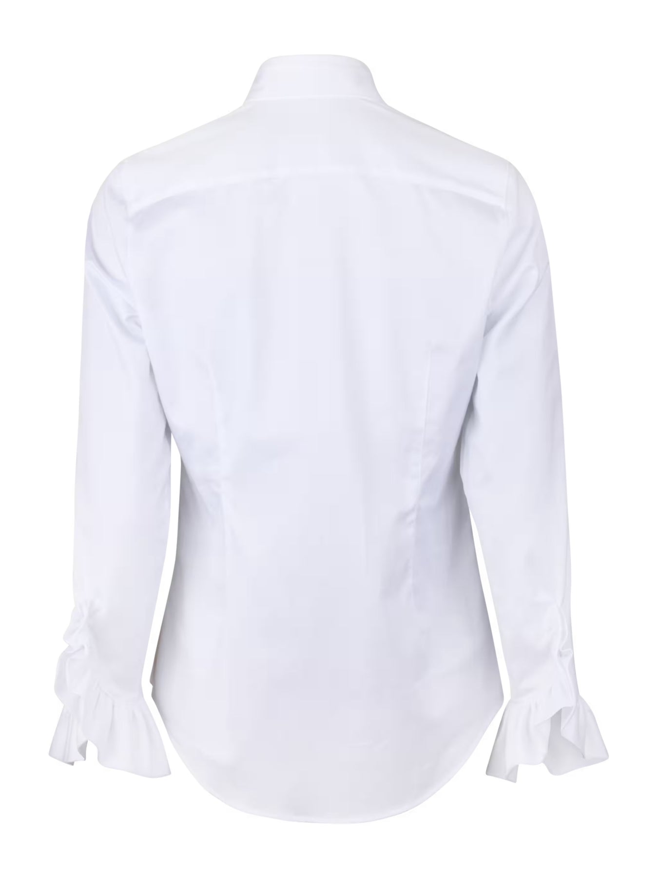 This shirt is made of cotton and X-Lance and has a feminine fit. The shirt is detailed with mother of pearl buttons, a classic collar and gathered frills details on the cuff.