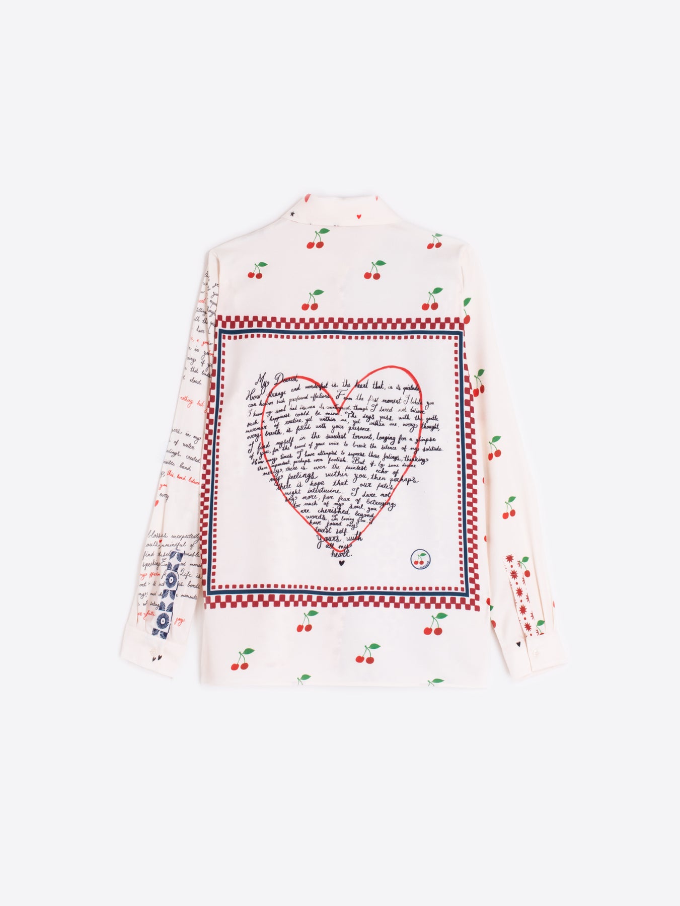 Straight-cut shirt with classic collar and front button closure. Front features two contrasting geometric prints. One sleeve is printed with cherries and the other with handwriting. The back displays a central heart filled with handwritten text, framed by cherries and a checkered border. Part of the “Love Letters” graphic series. Designed to be worn with matching trousers.