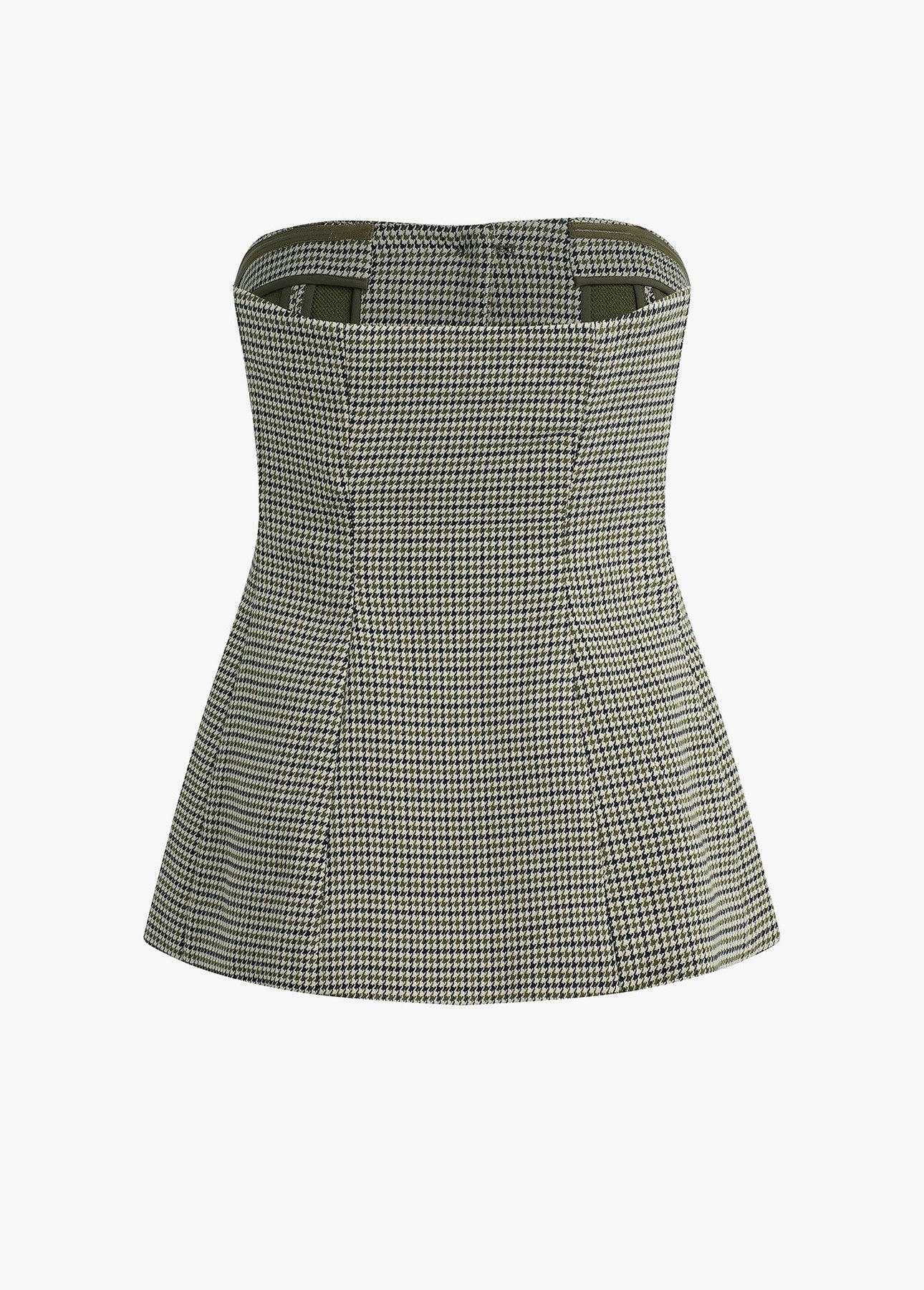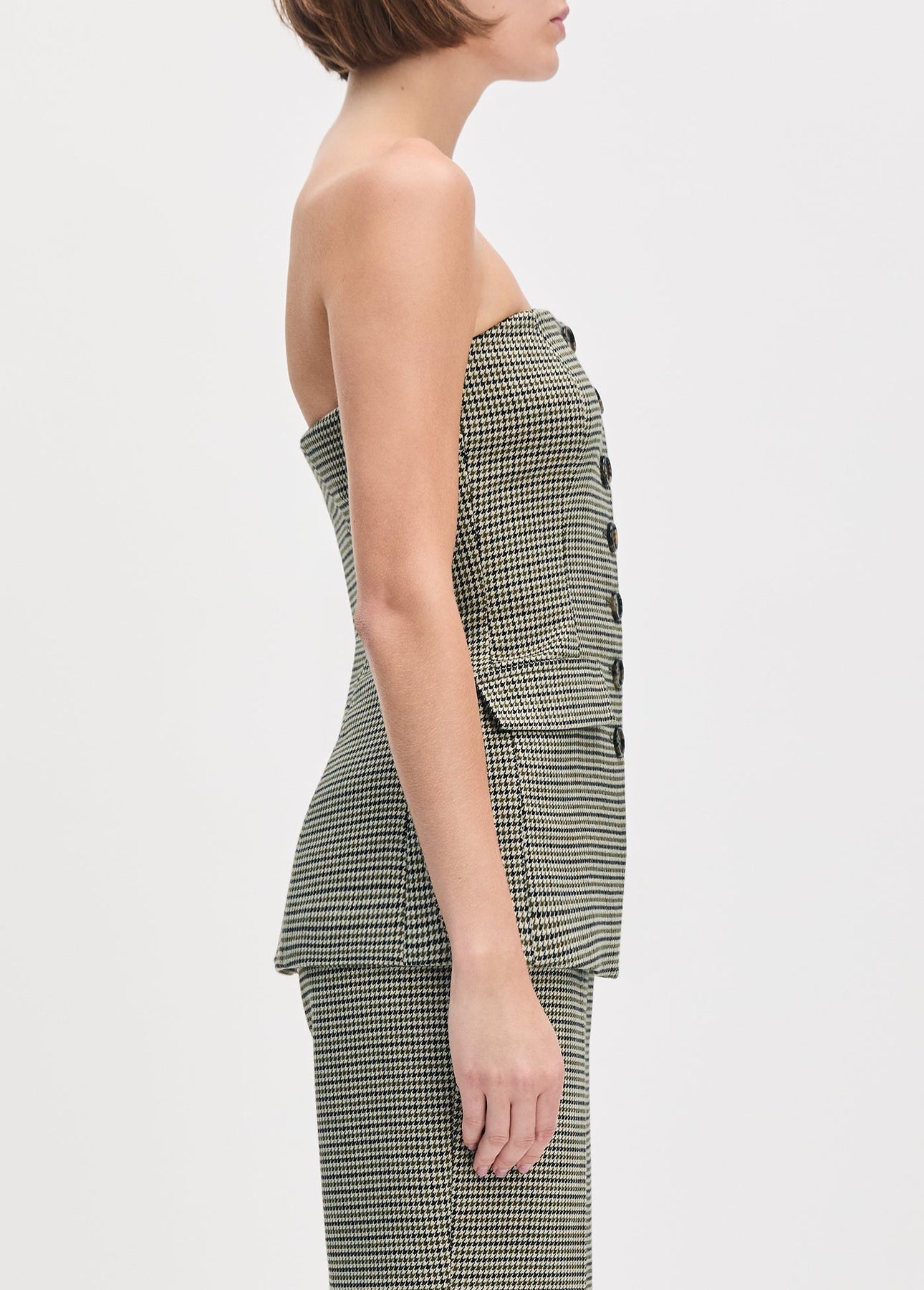 Borrowed from the boys, this bustier in a structured Cheshire Houndstooth has classic menswear styling--structured shape, front buttons and front flap pockets. The Phoebe Bustier is a classic and looks especially sharp paired with your favourite denim or styled as a set with the Favorite Skort in Cheshire Houndstooth.