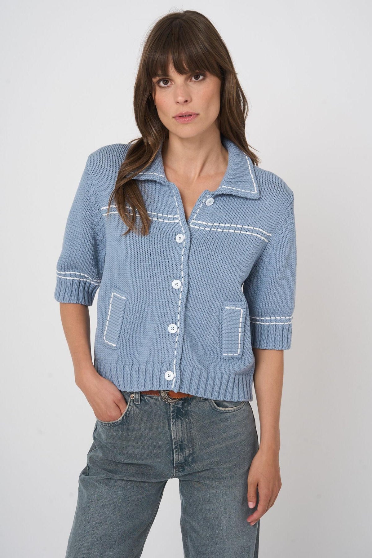 Chunky Knit Cotton-Blend Polo Cardigan Denim
