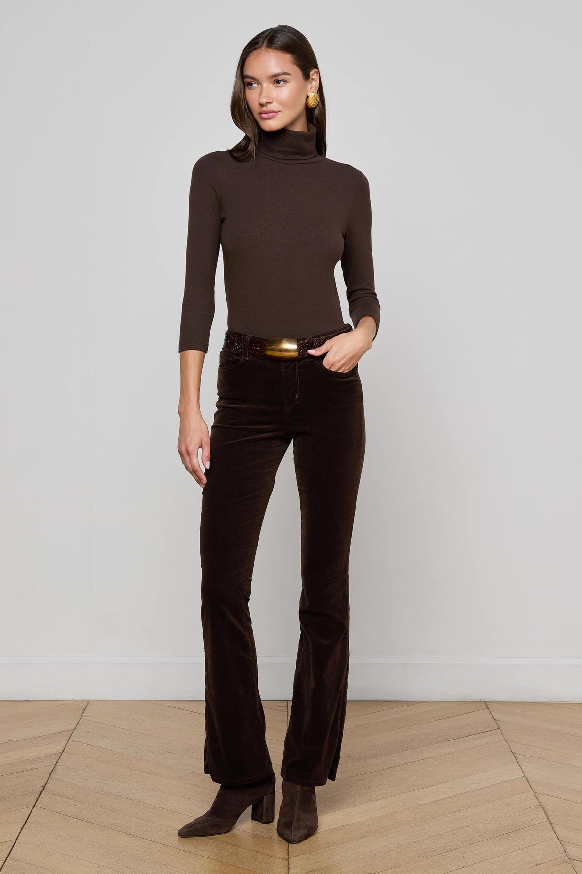 This style was featured in our Fall '25 NYFW presentation. The Stevie features a clean straight leg fit crafted from luxurious stretch velvet. Now in coffee bean brown.