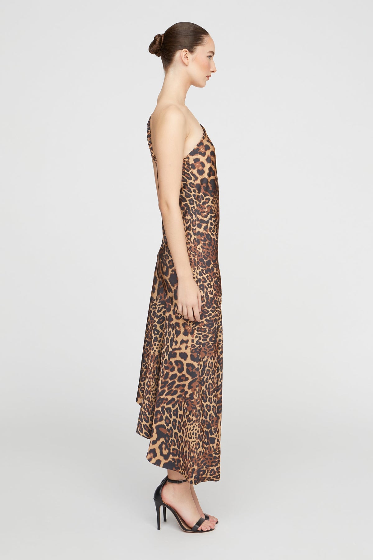 Cut in printed double-faced satin, this one-shoulder midi dress features an asymmetric hem and a bold leopard motif that speaks for itself. A fierce pick for cocktail parties, rooftop dinners, or any night that calls for a little extra pounce.