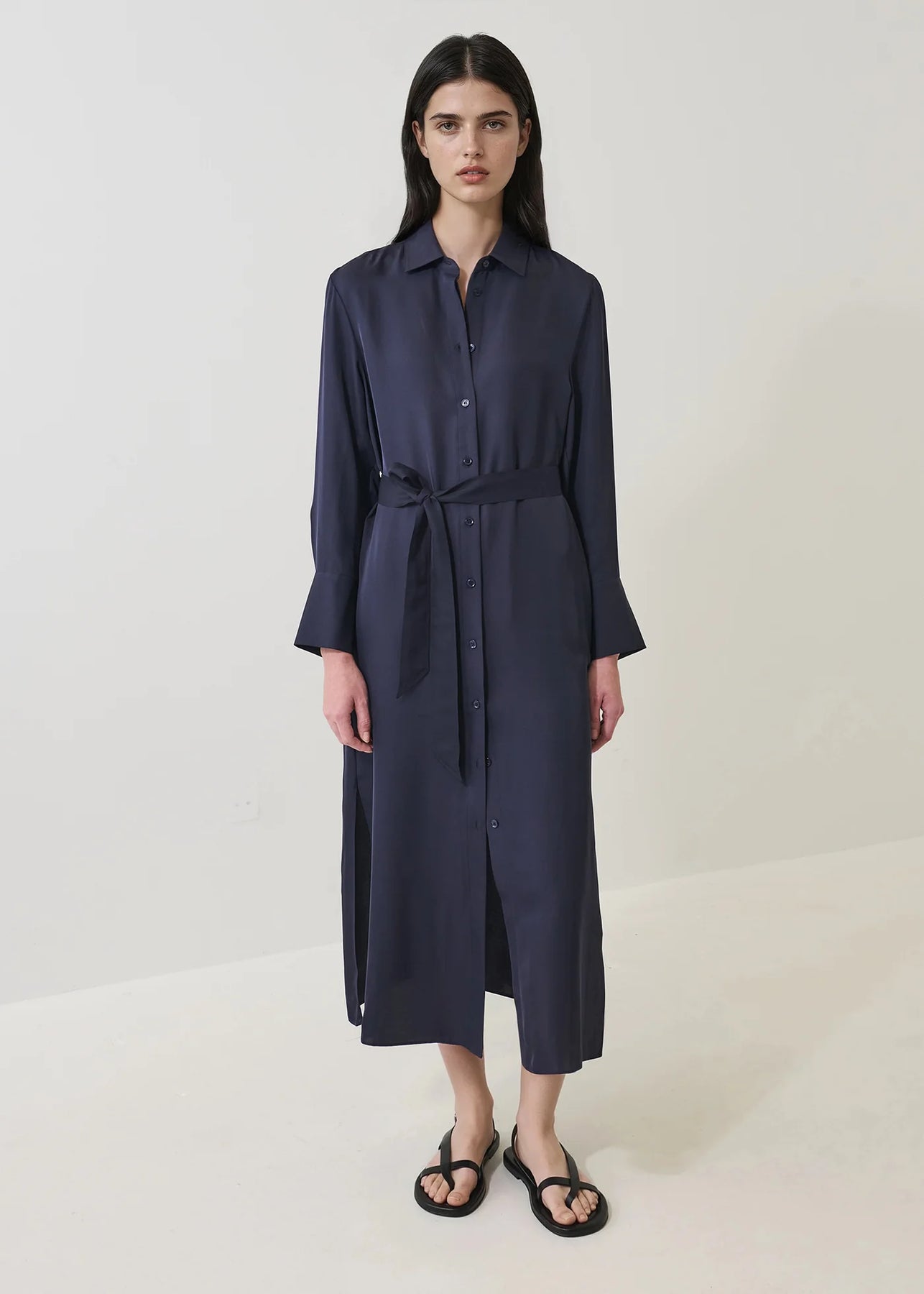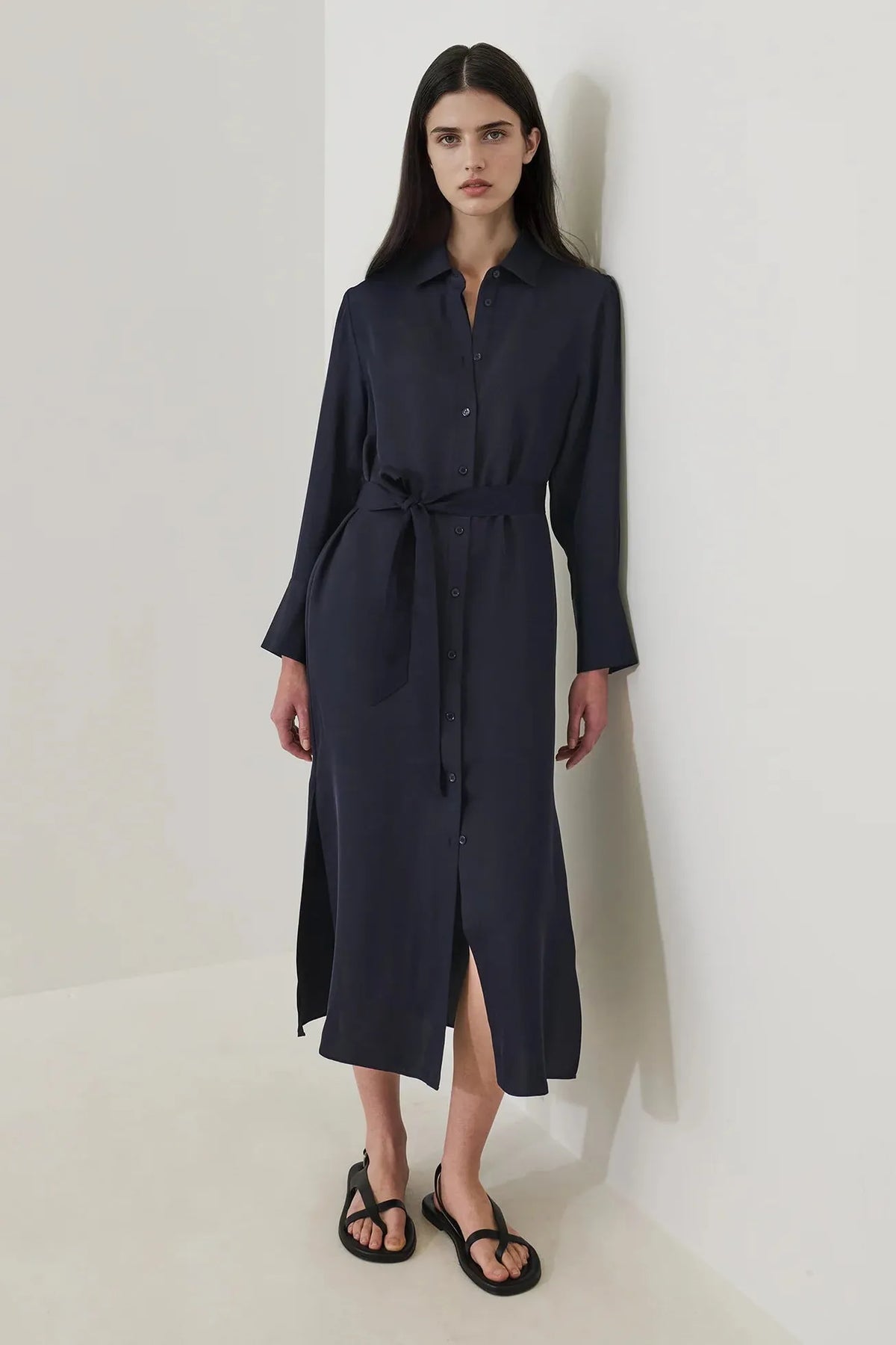 Our long sleeve silk shirt dress is made from a luxurious 100% silk fabrication. Offered in a timeless dark navy, this piece is designed to be a wardrobe staple for years to come. This piece is inclusive of a silk belt and can be styled with your favourite sandal or sneaker.