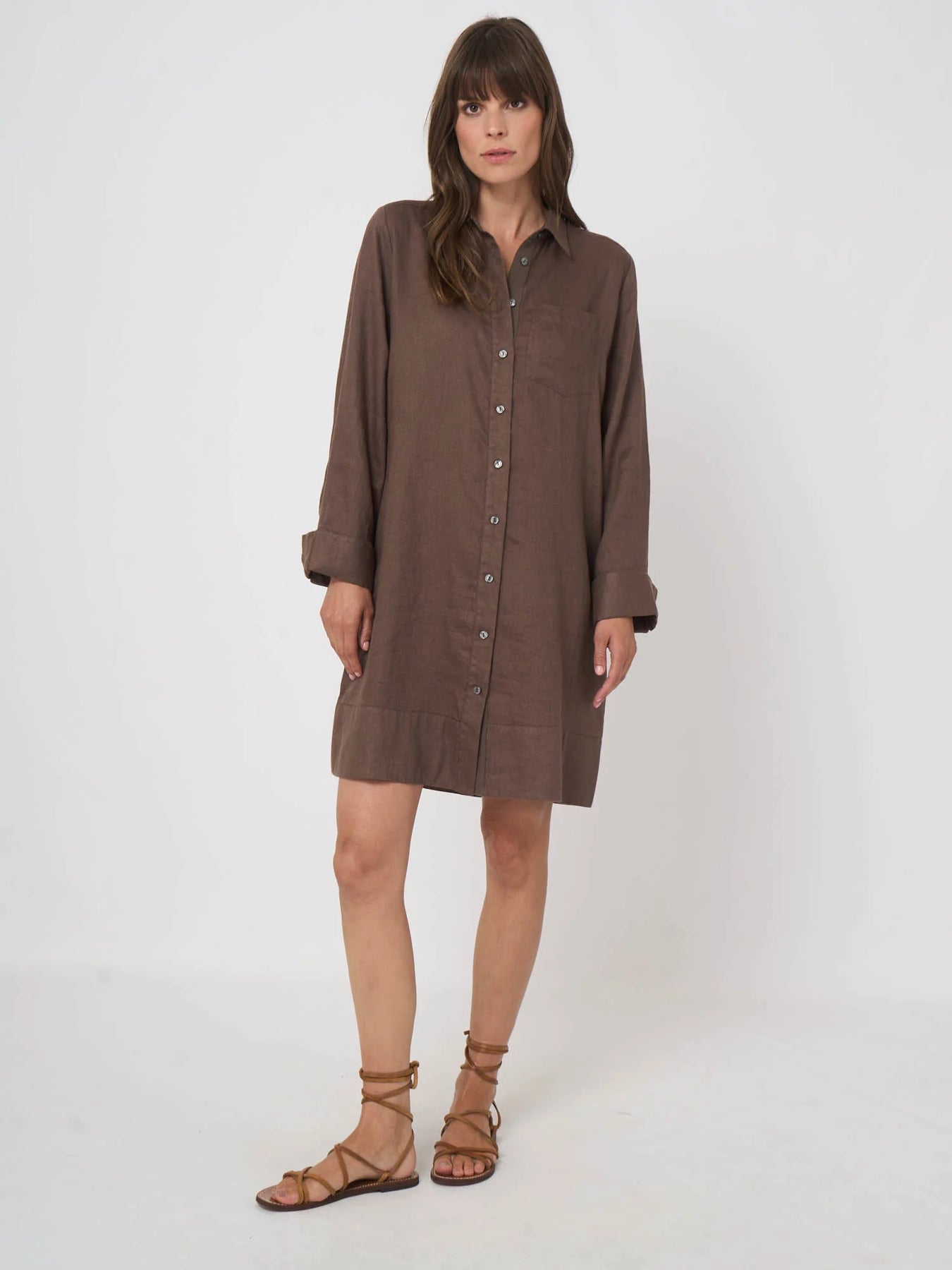 An effortlessly refined shirt dress crafted from breathable pure linen for natural comfort and ease. Designed with a relaxed silhouette, classic collar, and full button-front closure, it features a chest patch pocket and softly structured cuffs. The knee-length hem and fluid drape create a versatile piece suited to warm-weather dressing, balancing casual simplicity with understated elegance