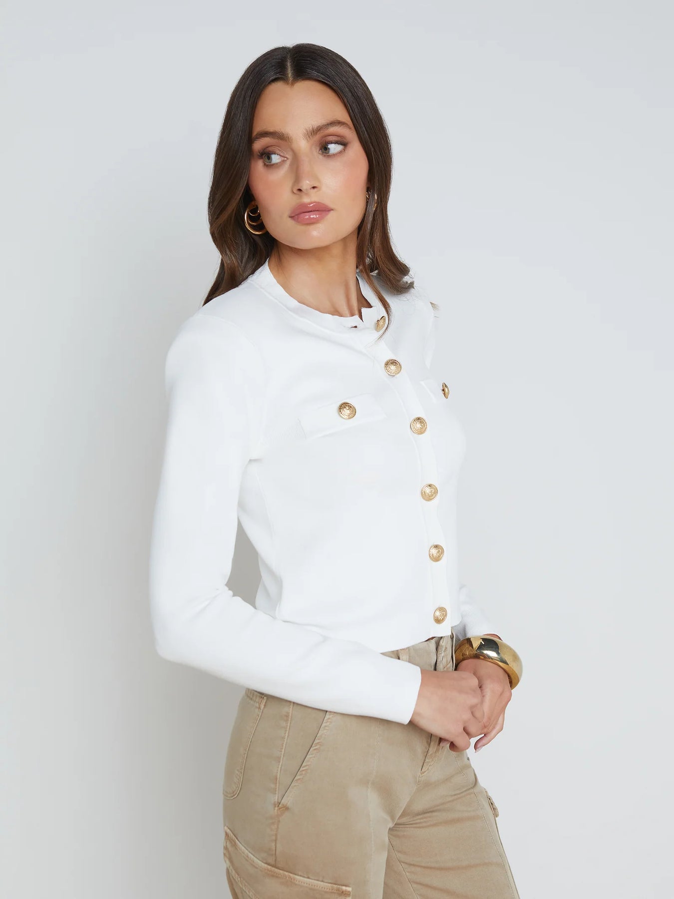 Our chic jacket-inspired cardigan, now in a ivory knit. The power knit Toulouse crew-neck cardigan tapers from modern strong shoulder to cropped waist, beautifully balancing the silhouette. Gold embossed dome buttons add a luxe element. Pair with white or cream denim for a subtle tonal look.