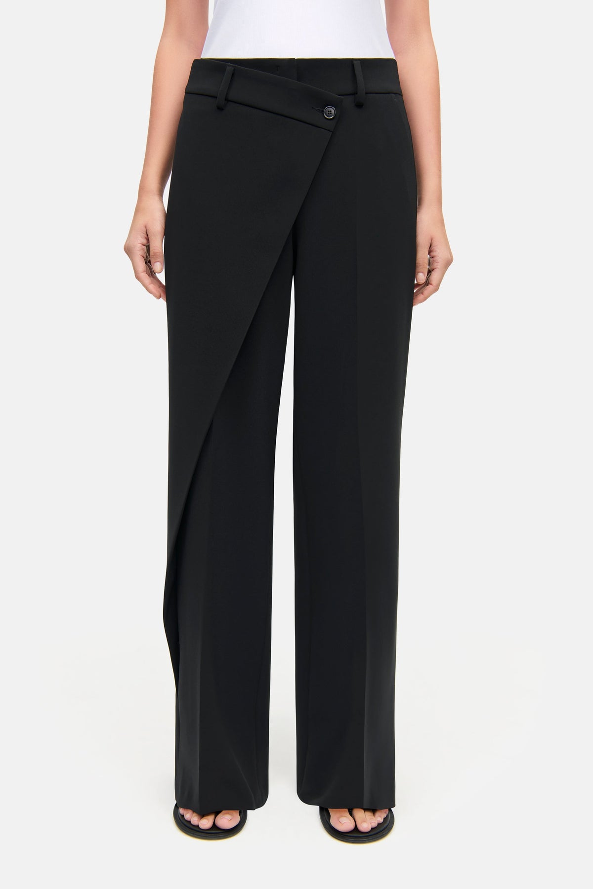ANAIS WRAP FRONT wide-leg trousers in full length. These black trousers are a true statement piece from the current collection, combining modern design with elegant casualness. The asymmetrical waistband with an overlapping wrap detail lends the style a stylish touch and makes it a real standout. The flowing wide-leg silhouette visually lengthens the leg and ensures a flattering fit – both in the office and in everyday life. The fabric impresses with its flowing, light feel and is particularly comfortable to wear. Thanks to the easy-care principle, the trousers are also easy to care for and uncomplicated to use.