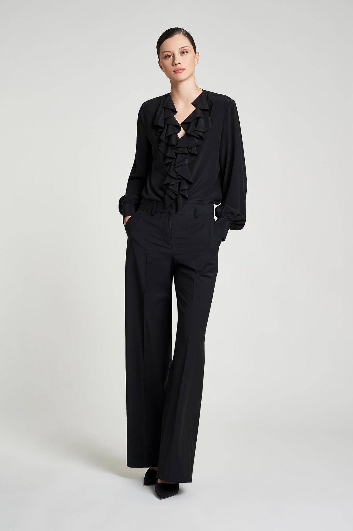 Women's loose-fitting v-neck blouse detailed by two rich double fabric ruffles that reach the hem. Pences behind. Wide sleeves gathered at the wrist to give volume. Wrist with 2 buttons. Even rim, medium-low hip length.