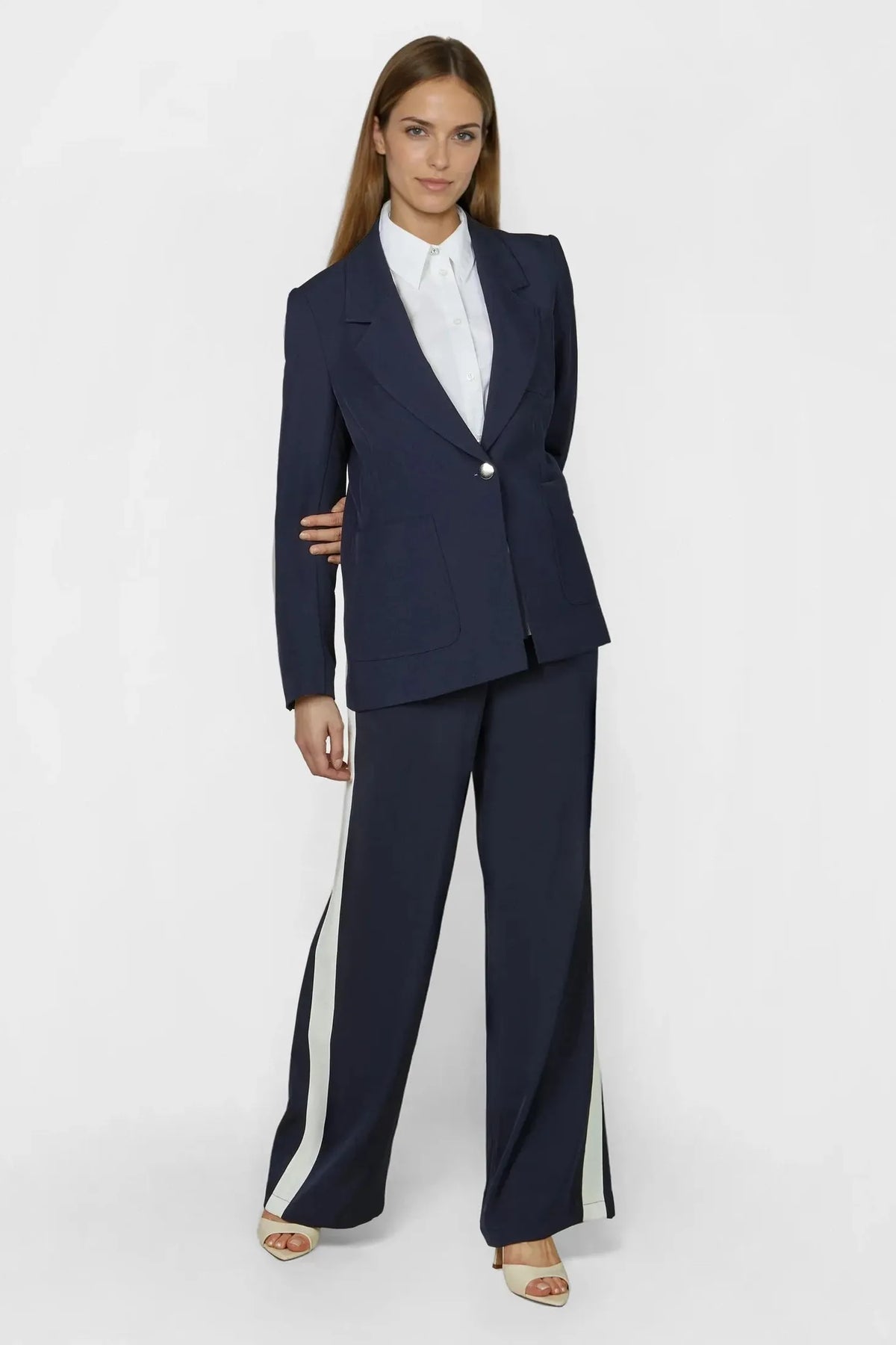 With their softly draping twill fabric, these pants perfectly balance casual style and structure. The contrasting side stripes give the design a sporty touch without compromising on elegance. Functional side pockets and a waistband with loops ensure everyday practicality and styling versatility. Piped pockets on the back complete the design. Ideal for modern looks.