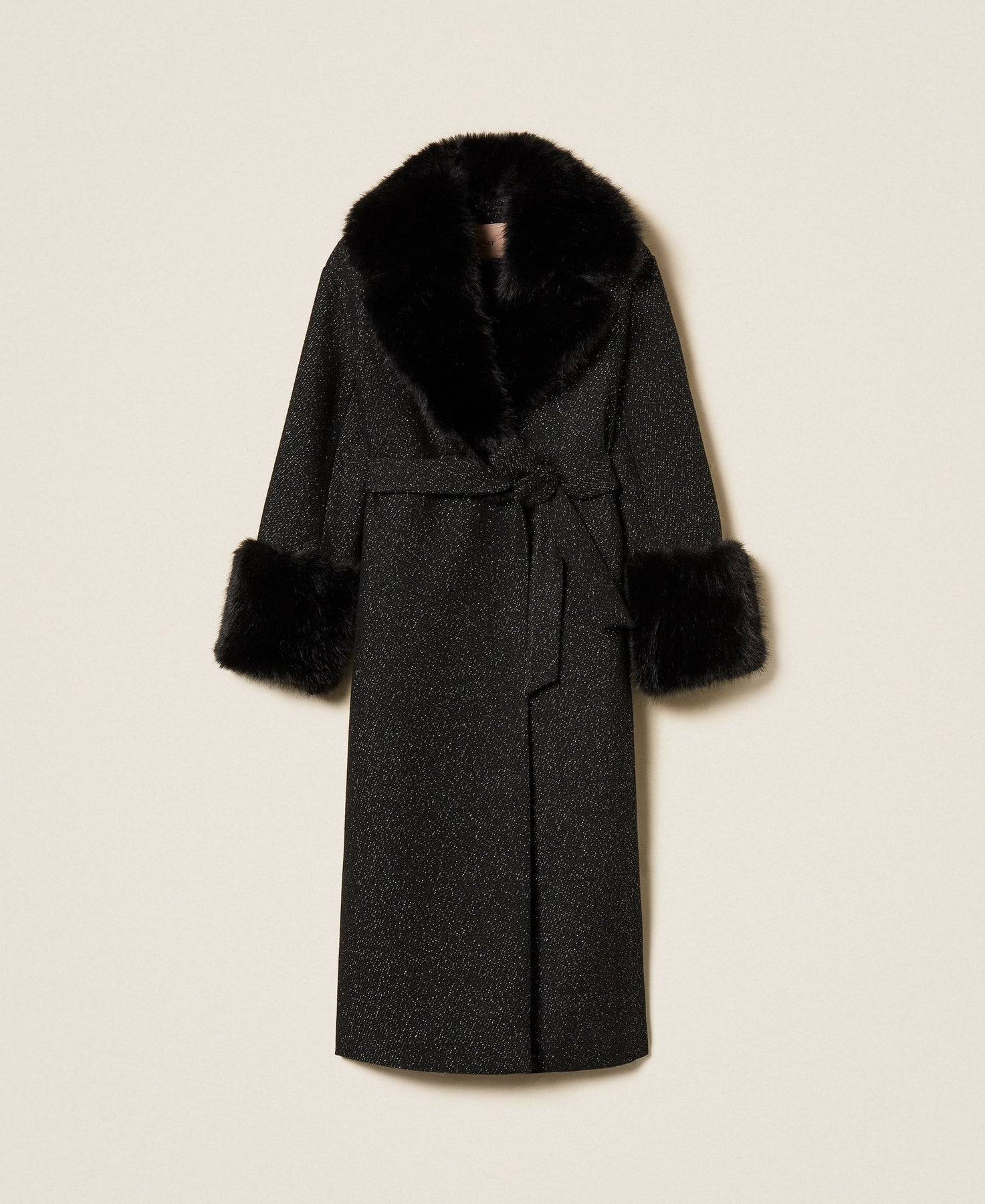 Long patterned wool cloth coat with lurex thread and removable faux fur collar and cuffs. Lapels, double-breasted button fastening, long sleeves, inset side pockets, central slit at the back, matching belt, quilted lining, Oval T logo plate at the back, straight fit.