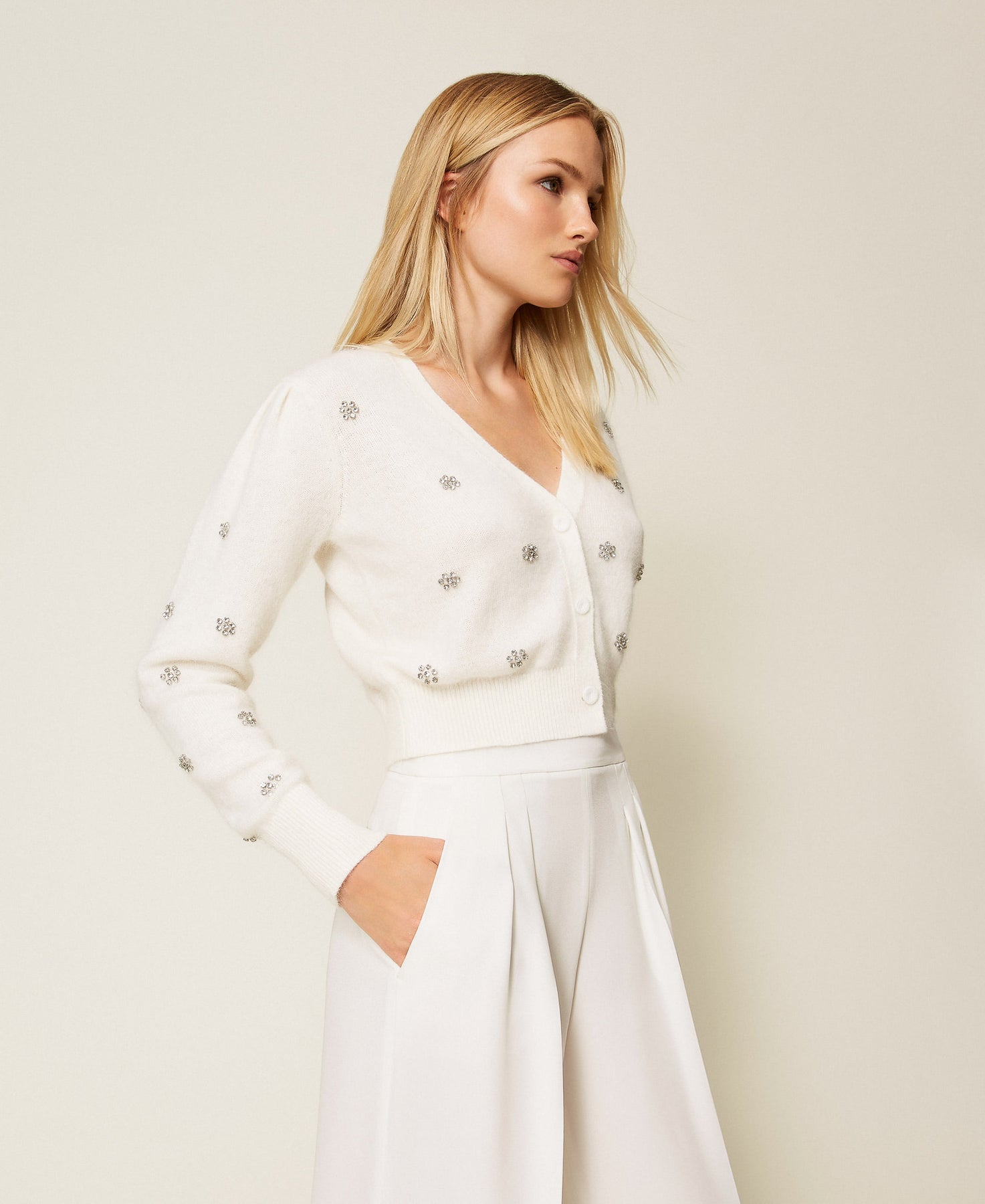 Angora blend plain knit cardigan with riveted rhinestone flowers. V neck, long sleeves, covered button fastening, Oval T logo plate covered in thread at the back, loose fit.
