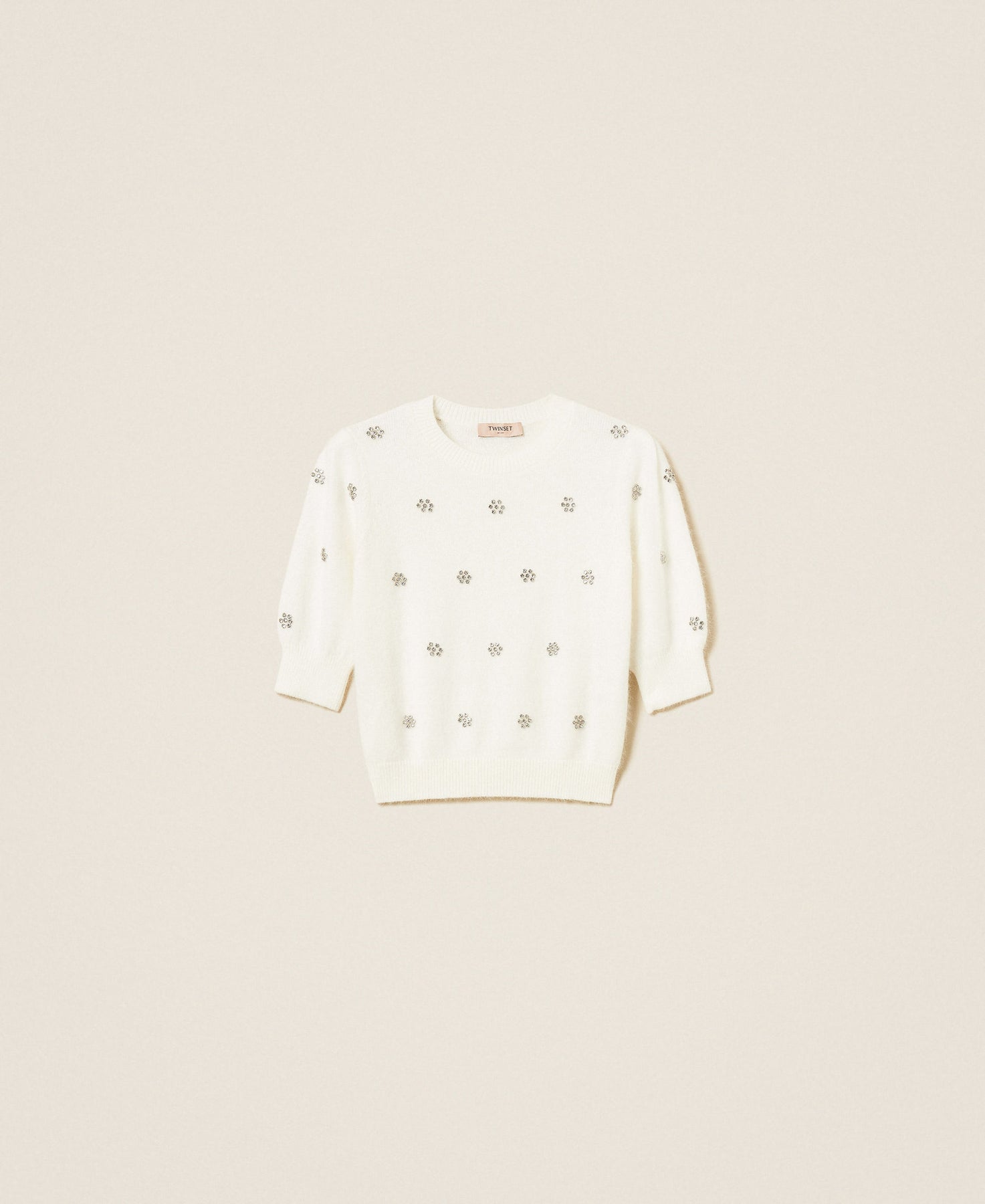 Angora blend plain knit jumper with riveted rhinestone flowers. Crew neck, short sleeves, Oval T logo plate covered in thread at the back, loose fit.