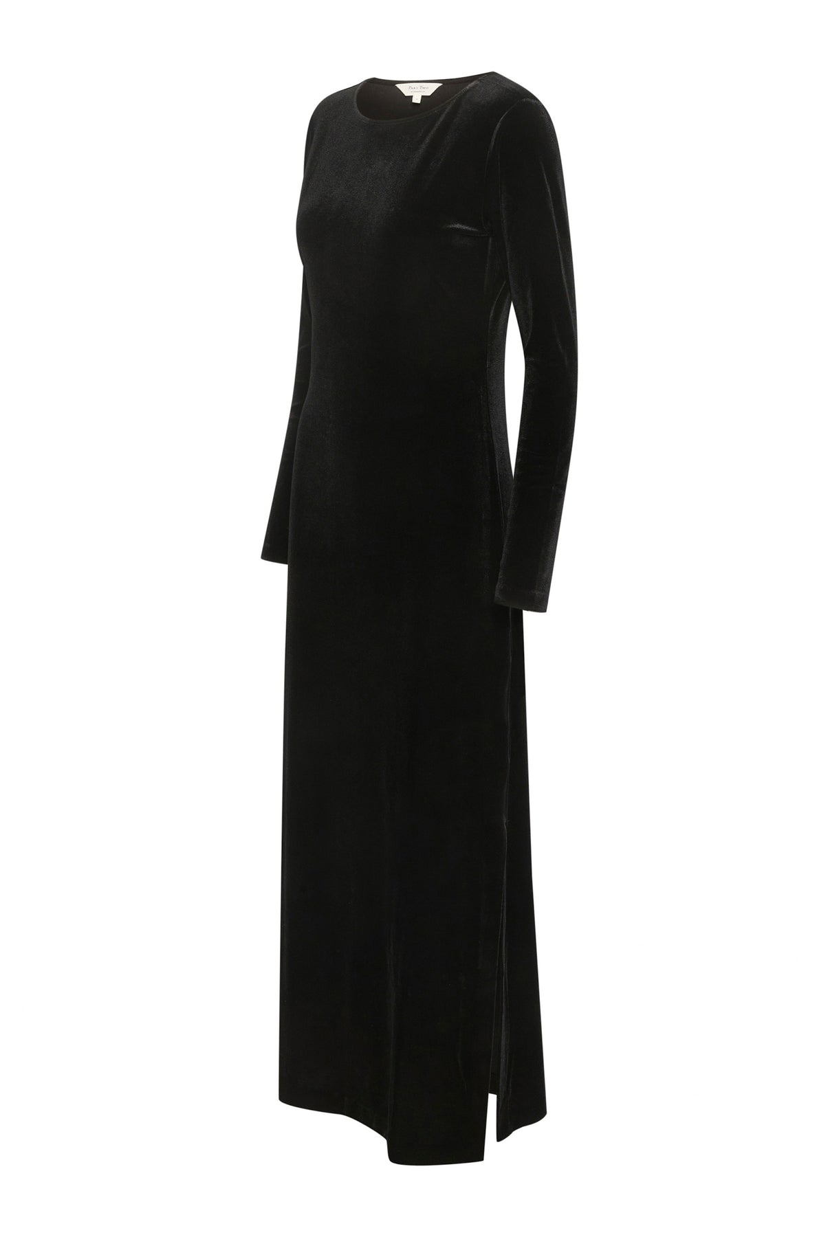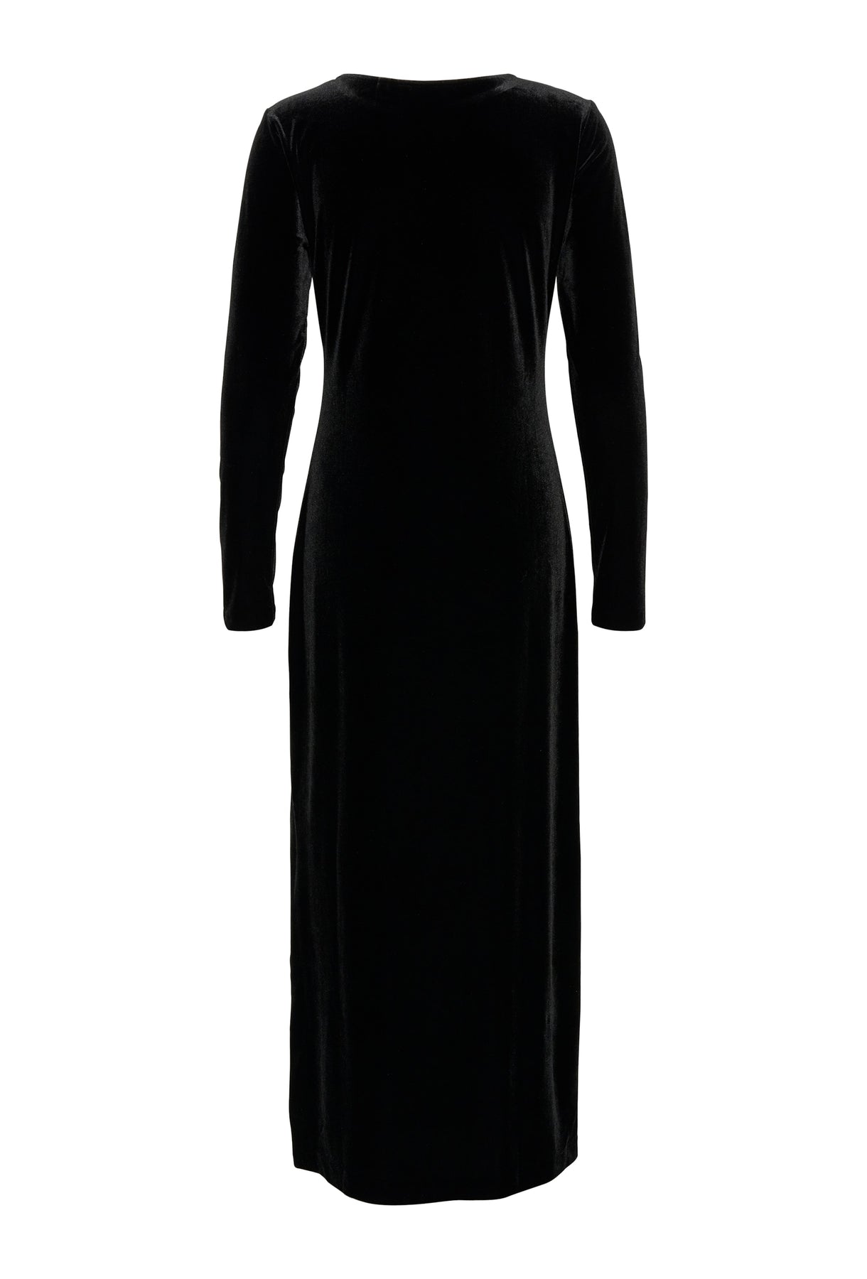 The model is 176 cm tall and wears a size M. This elegant velour dress with long sleeves and a flattering, fitted silhouette is perfect for special occasions. The classic cut and shiny material give it a sophisticated look.