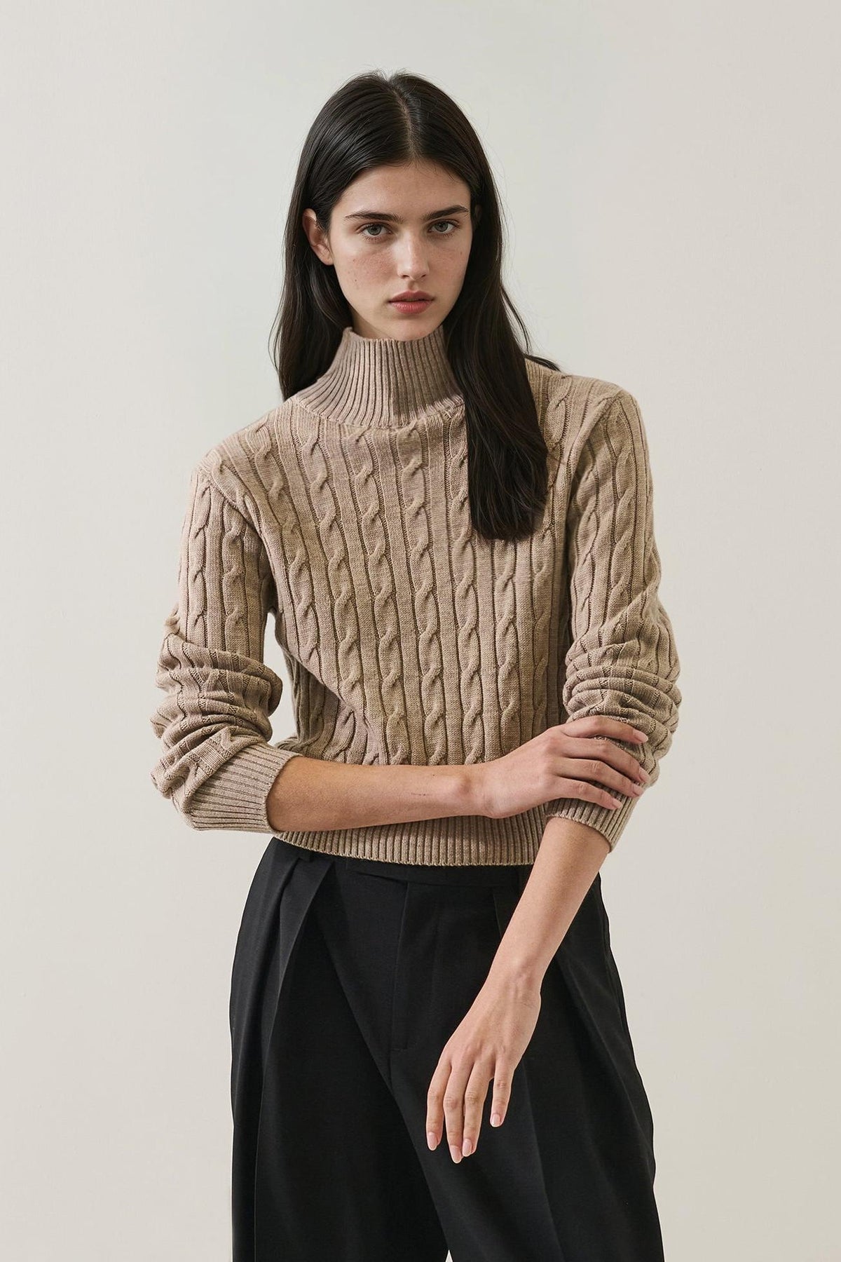 This extrafine merino cable mock neck exudes sophistication and is a timeless wardrobe essential. Featuring beautiful cable detailing throughout, this piece is designed to be effortlessly styled with your favourite high-waisted trouser or denim.