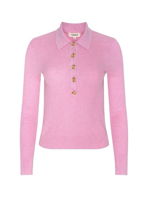 The L’AGENCE essential long sleeve knit and one of our fashion director’s favorite closet heroes. This classic henley top is now back in pink with floral buttons.