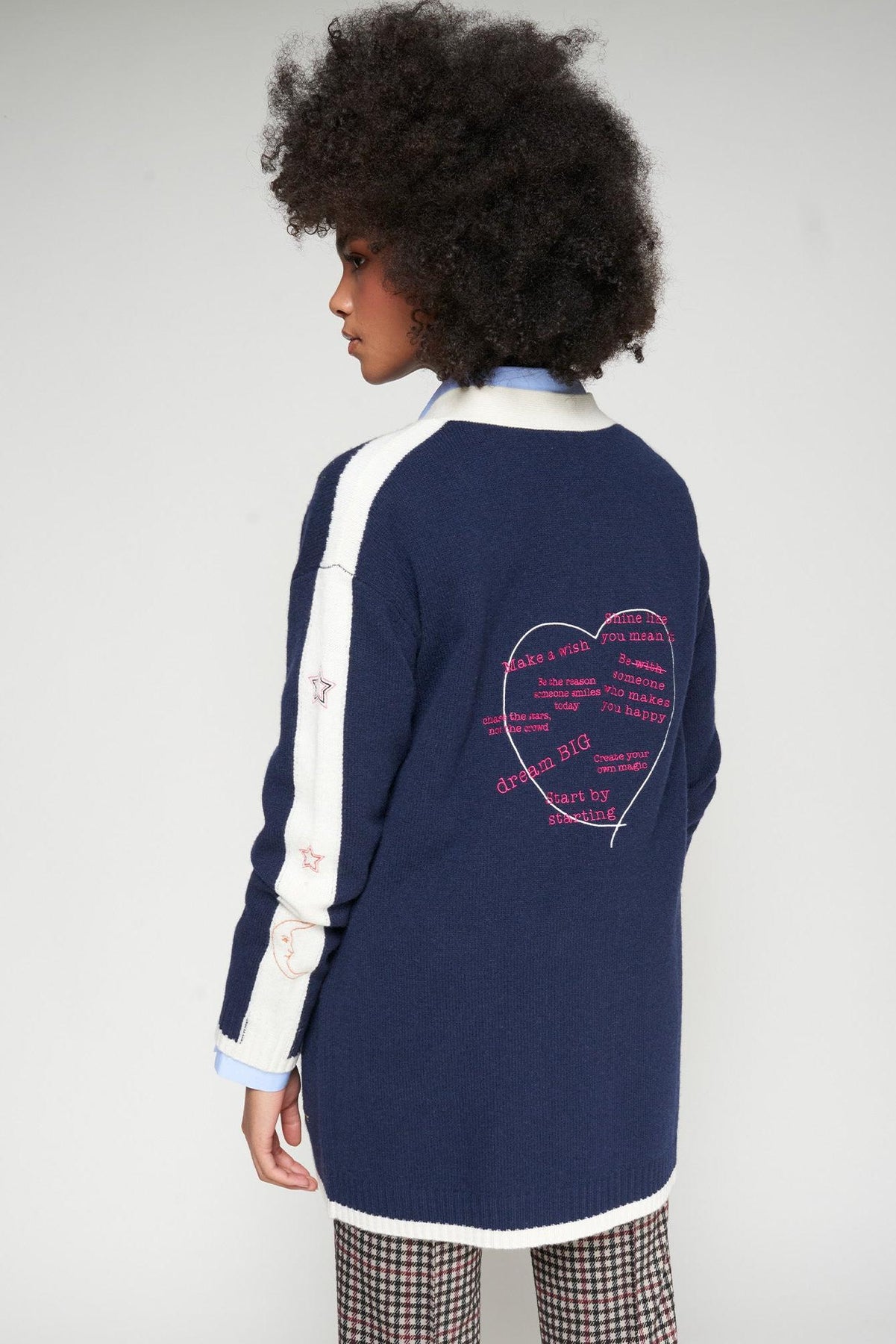 Long navy blue cardigan with multicolor embroidery across the front, sleeves, and back. Large heart-shaped embroidery with pink stitched messages at the back. Ivory ribbed trim at the neckline, cuffs and hem. Front closure with multicolored fantasy buttons. Made of 100% merino wool, soft and warm.
