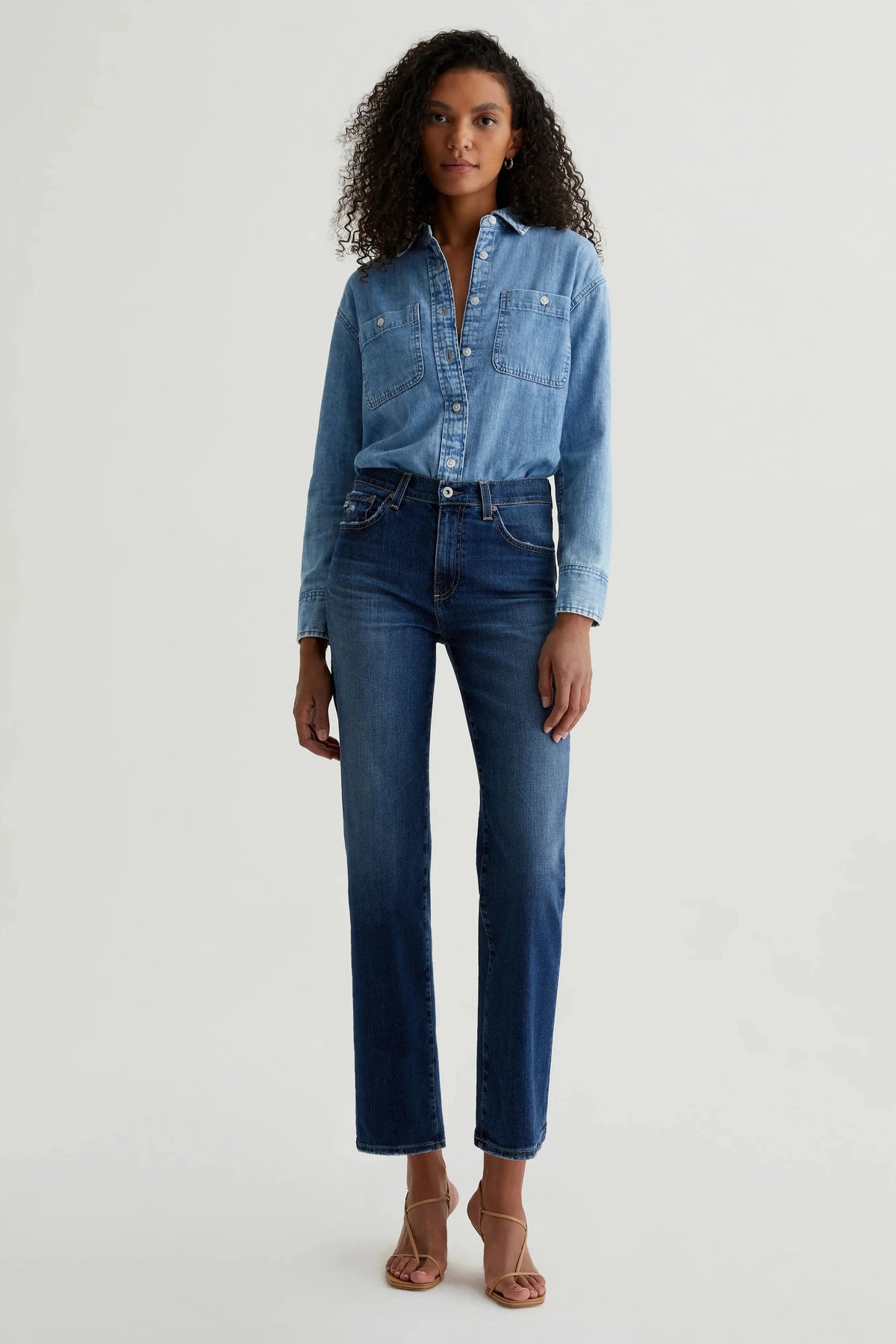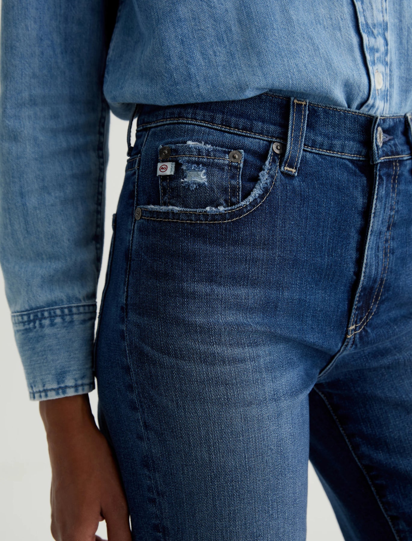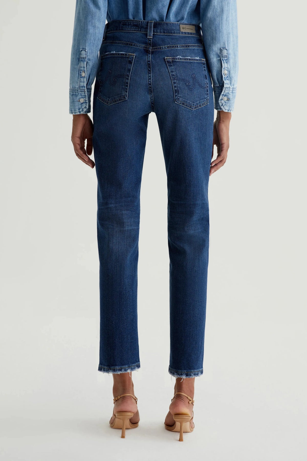 The Brinley Crop features a mid-rise waist and a straight-leg silhouette with frayed, ankle-baring hems. Designed in Vintage Comfort Stretch Denim from Italy, these cropped jeans for women have a dark indigo AG-ed™ wash with faded details, worn edges, and a bit of distressing at the pockets.