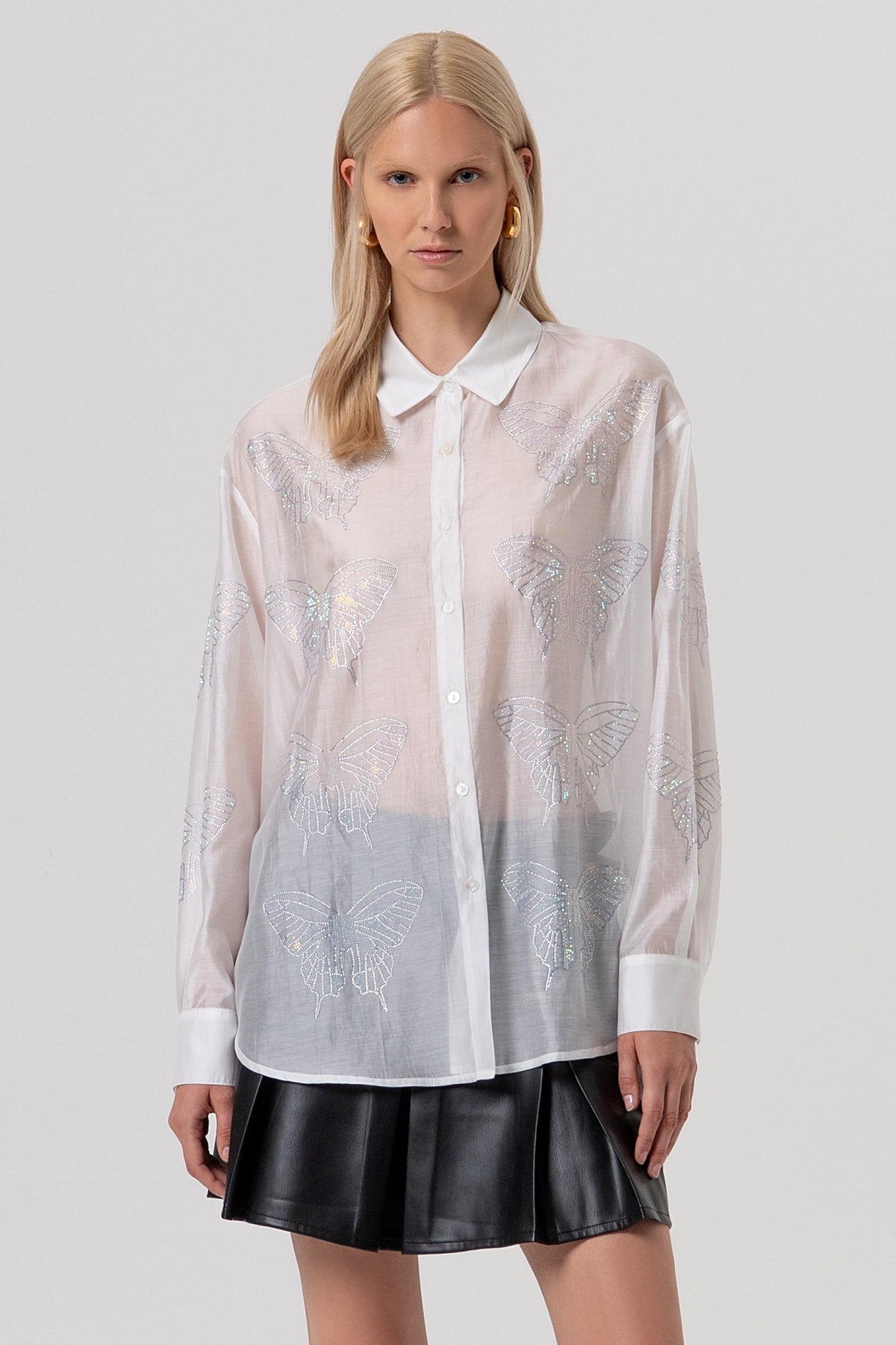 Shirt regular fit made in tencel organza. Classic cut neck, butterflies with strasses, central buttons for opening and long sleeves