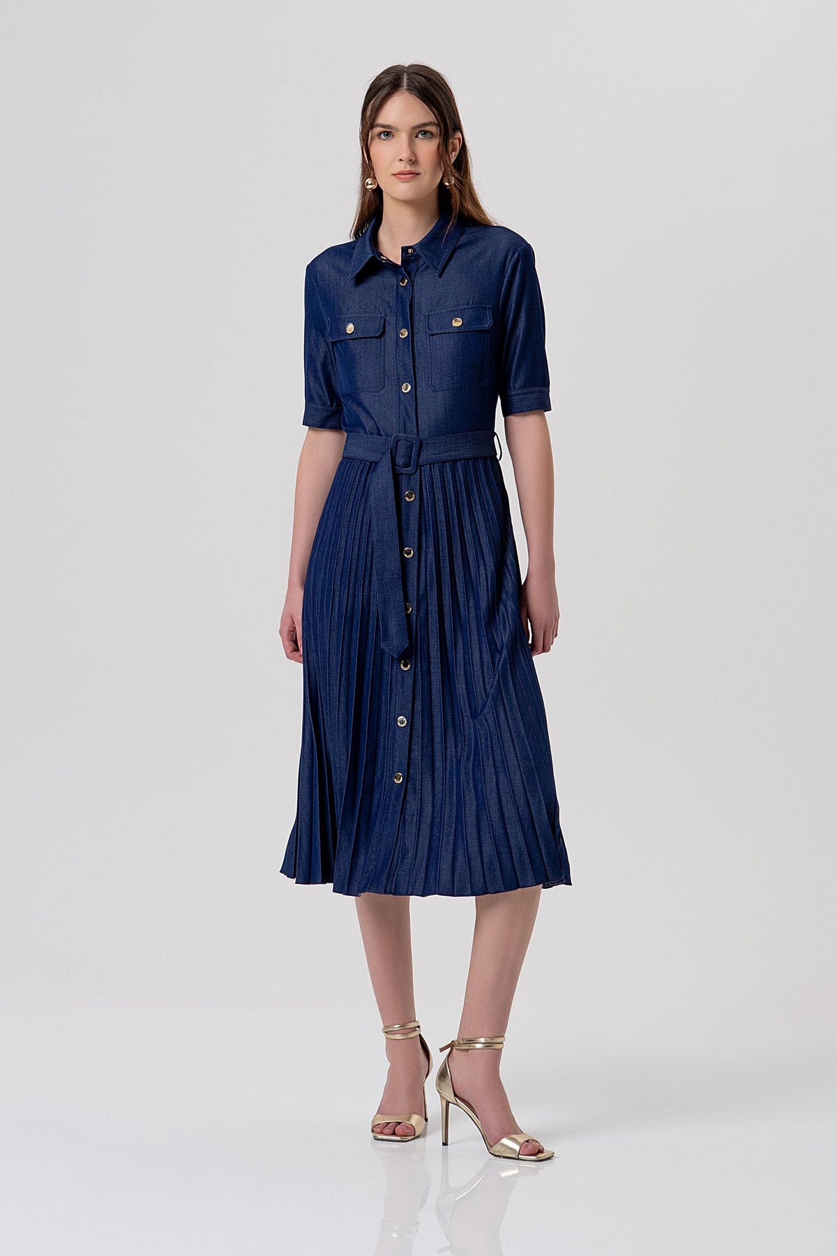 Chemisier dress regular fit middle length. Classic cut neck, metallic buttons for opening, pockets at the chest, belt at the waist, skirt with plissè effect and 3/4 sleeves