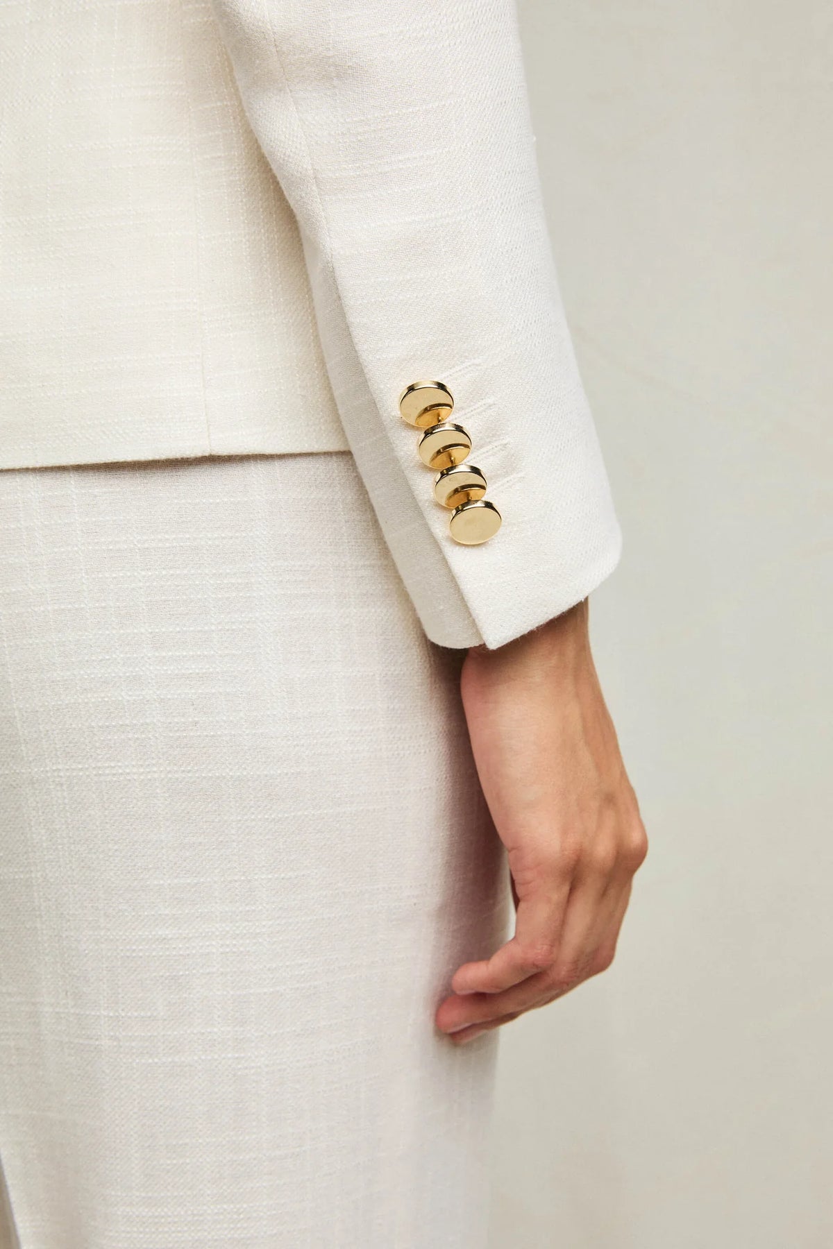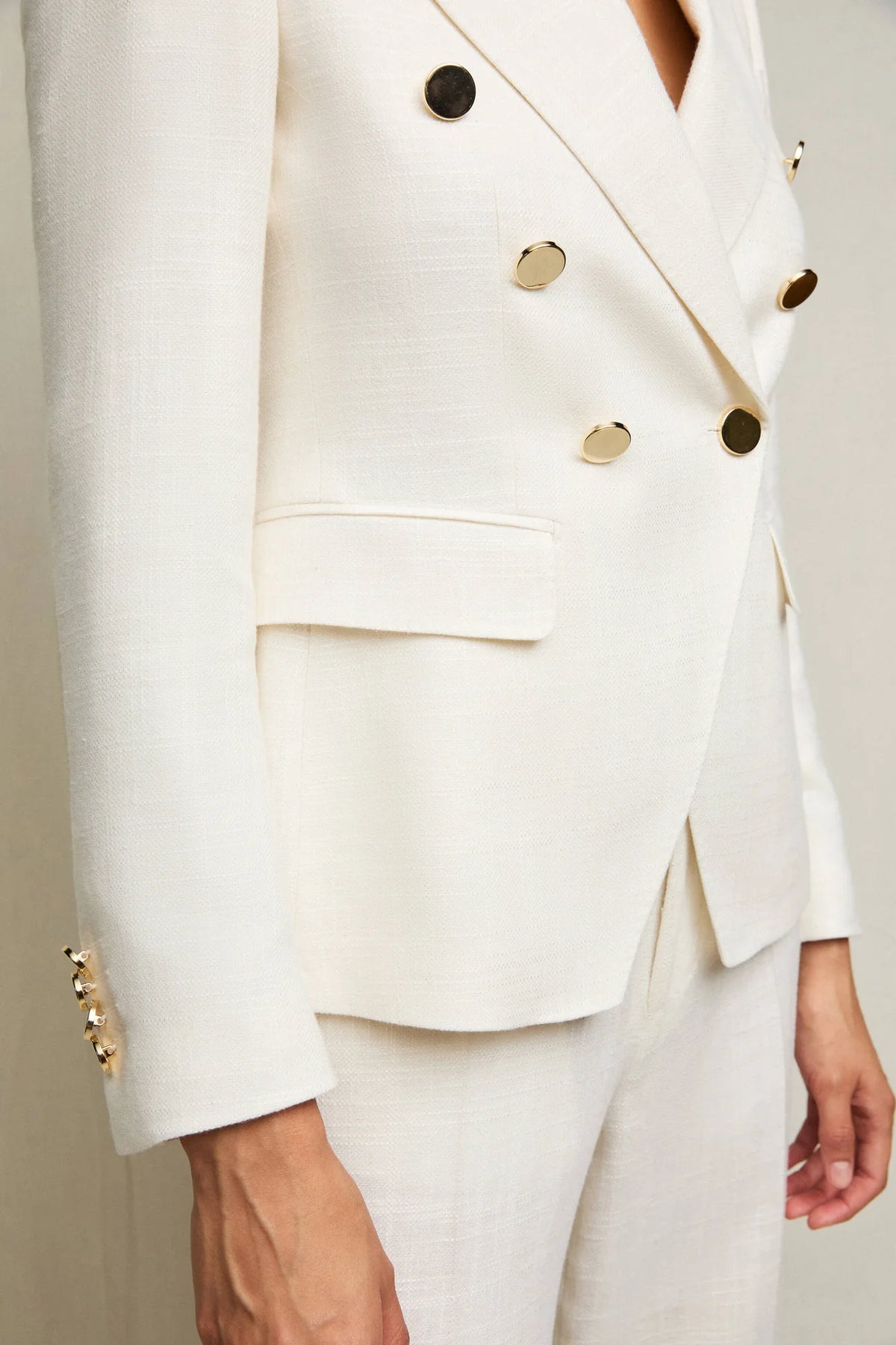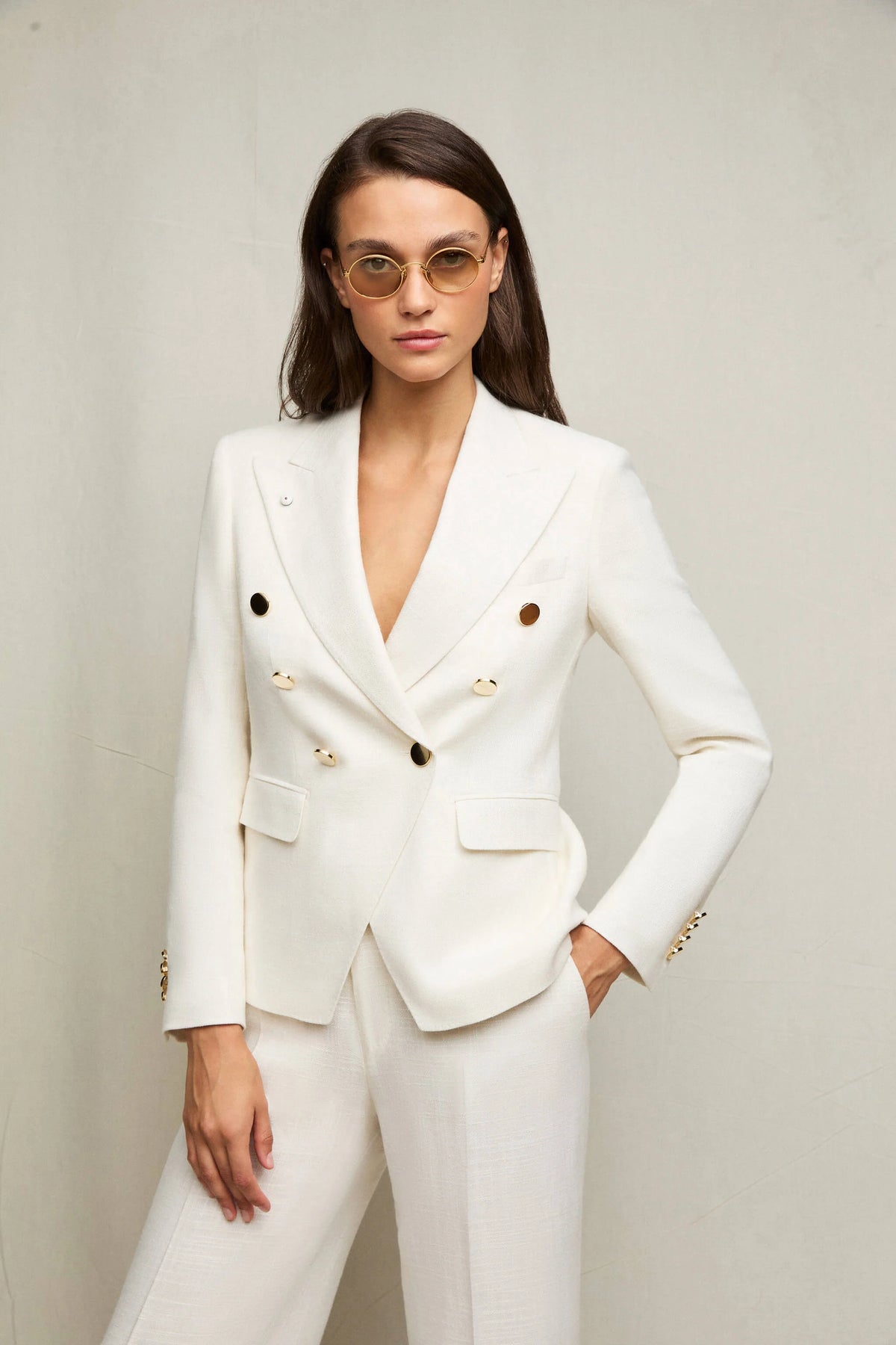 This womens double-breasted jacket has a slim silhouette that elegantly flatters the figure. The peak lapels draw the eye upward, offering a dynamic contrast to the clean, structured design of the flap pockets. The double-breasted construction is accented with metal shank buttons in a refined platinum gold finish, a bright touch that enhances the natural white fabric and lends this piece a contemporary, sophisticated allure. Fully constructed and lined, this blazer maintains its sharp silhouette flawlessly, while its untreated fabric adds visual depth and understated elegance.