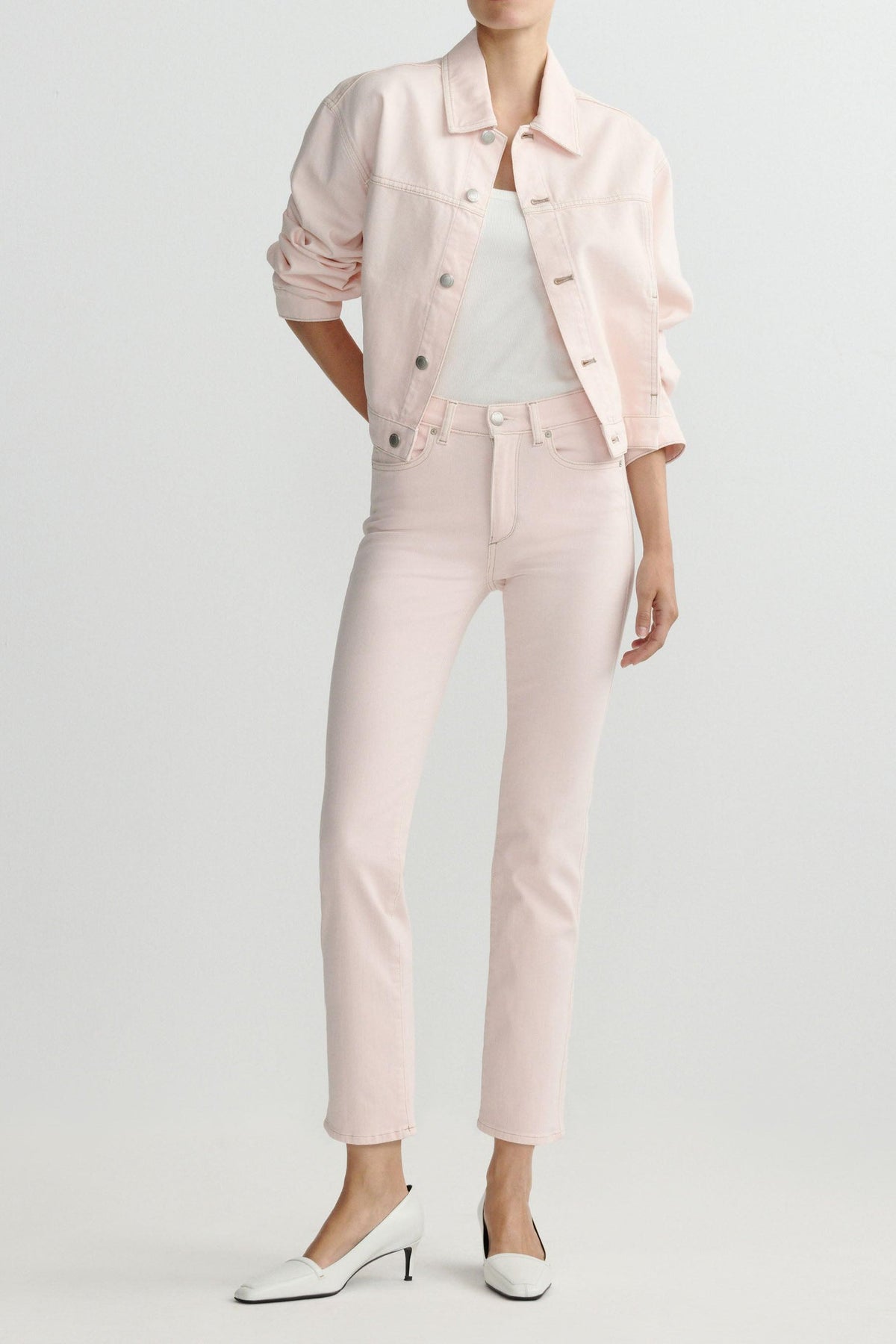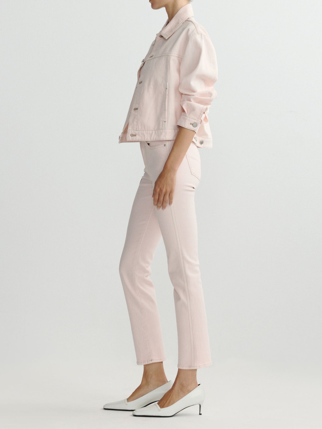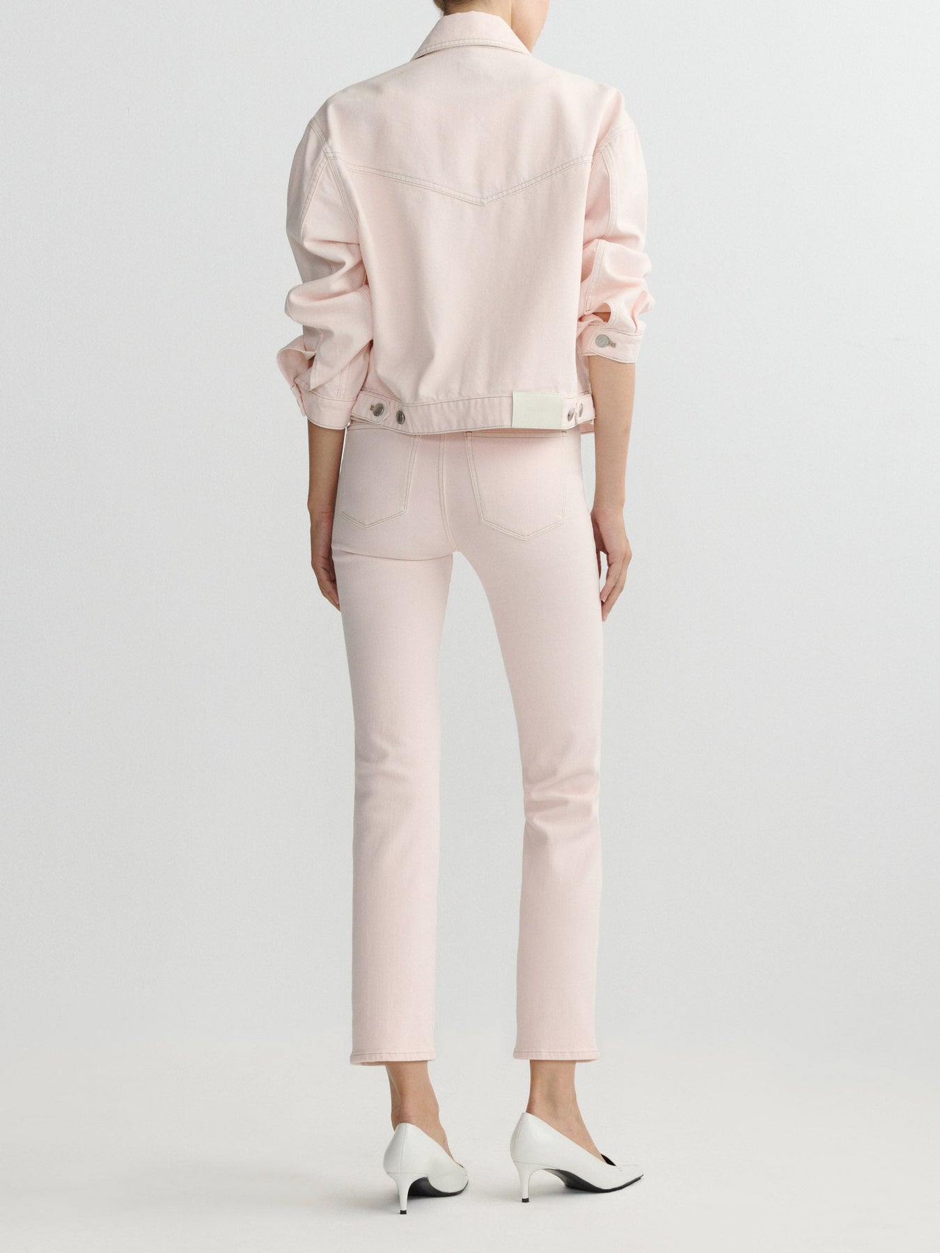 Ballet is a soft, blush pink denim. It features silver hardware, khaki stitching, a clean hem and an ecru back patch.