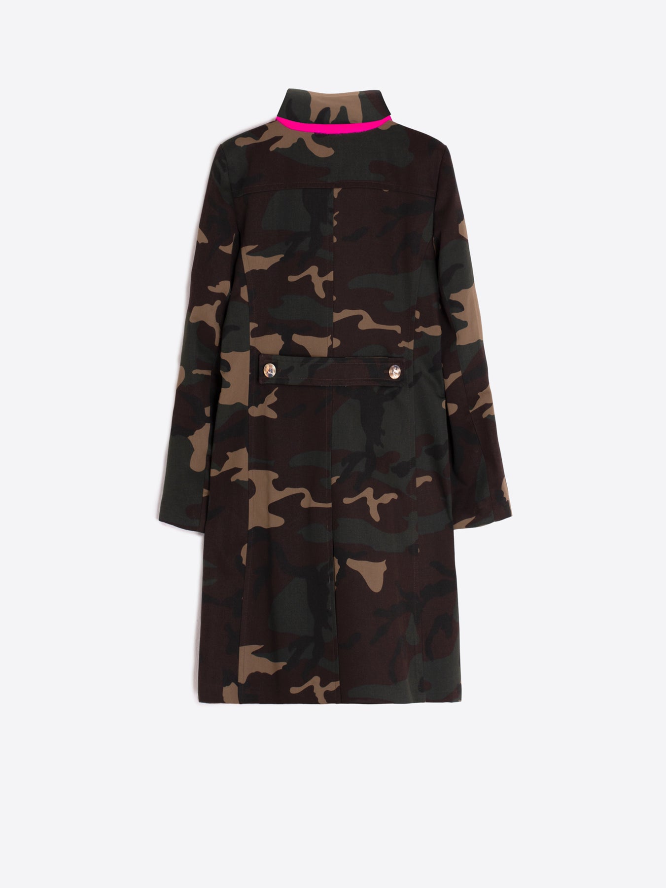 Straight-cut trench coat in a brown and green camouflage pattern. Made from a cotton-polyester blend. Features a collar lined in bright fuchsia on the inside and front closure with visible metallic buttons. Decorative back flap with two buttons.