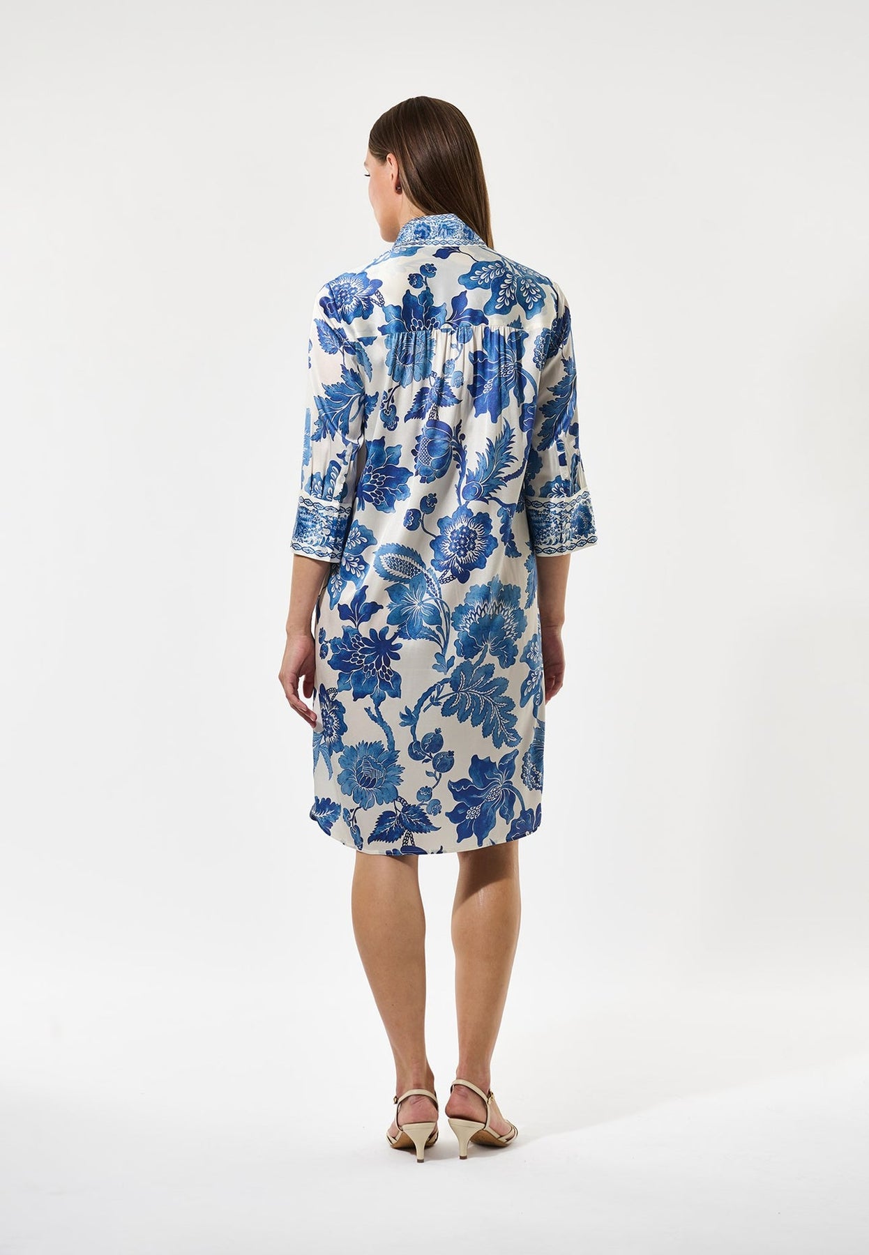 One of Dea Kudibal’s signature styles, this easy fit mid-calf length dress is perfect for all body shapes. The kimono neckline and collar give it an elegance whilst the deep sleeves with cover buttons have a relaxed and chic attitude This dramatic version comes in silk twill with printed blue flowers and contrast border at the cuffs and neck.