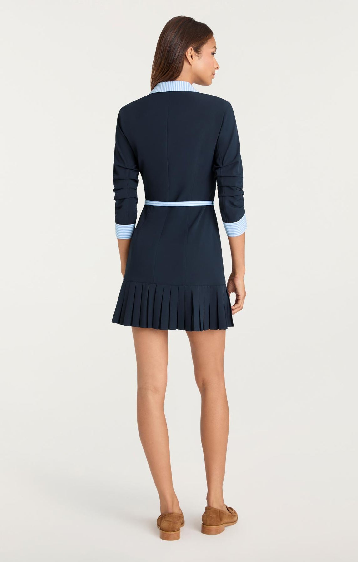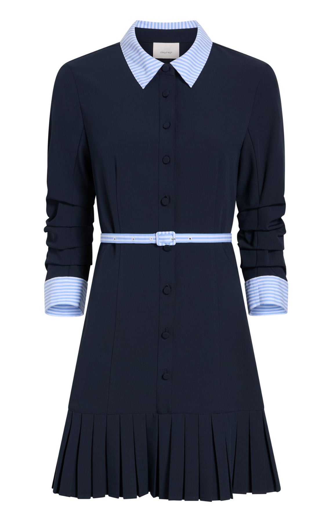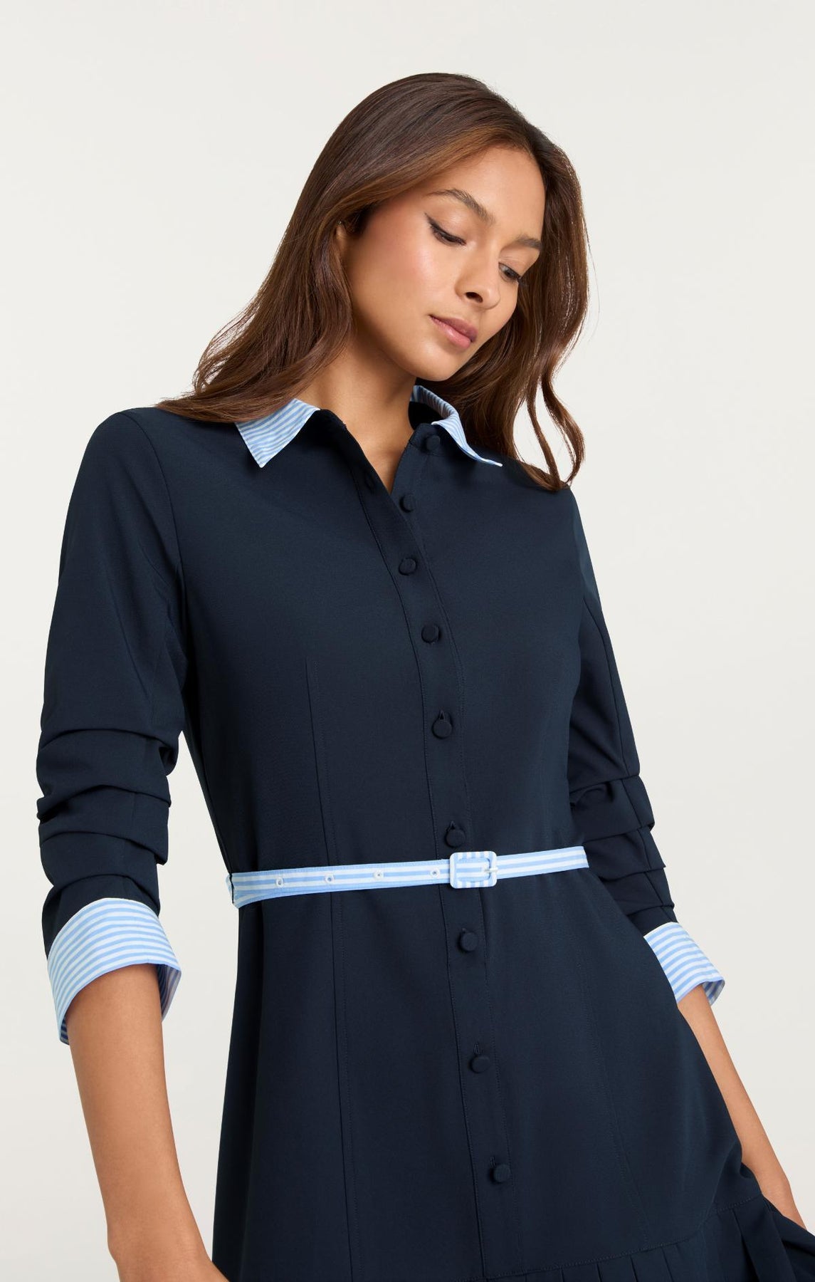 Introducing the Stripe Shirting Lucilla Dress, a refined piece that balances classic tailoring with modern sensibility. Eye-catching contrast stripes frame the collar and cuffs, while a cinched skinny belt highlights your silhouette. The pleated skirt offers graceful volume, complemented by scrunched three-quarter sleeves for contemporary appeal.