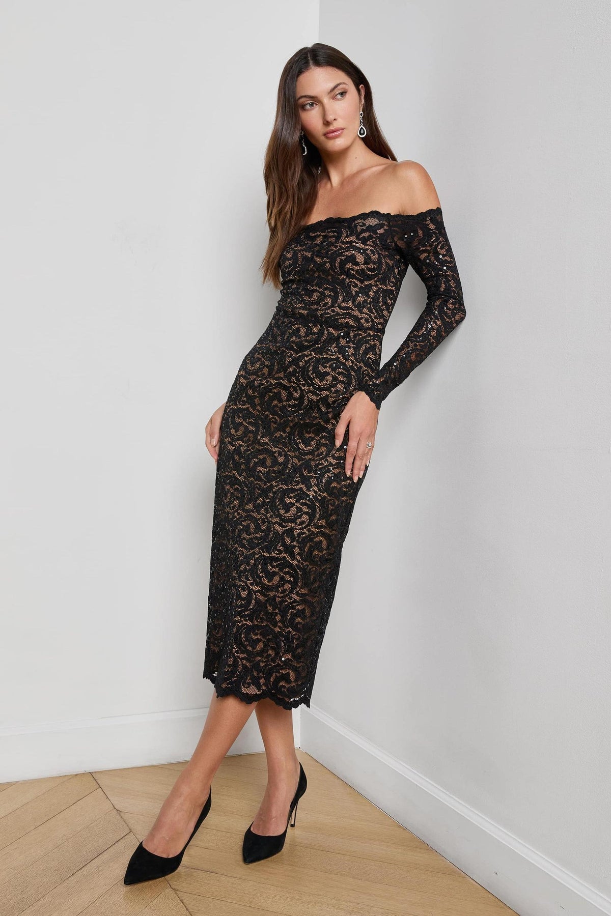The Lindsay dress is pure allure, crafted in black lace with a nude lining. Sequins woven through the pattern bring subtle shimmer. The off-shoulder neckline and long sleeves frame the figure with understated drama, making it an evening-ready standout.