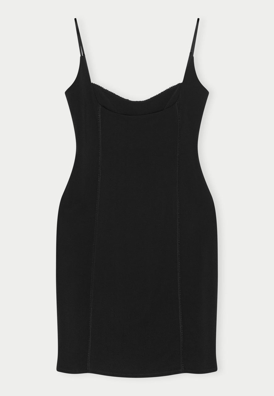 The ultimate little black dress — defined by subtle structure and refined femininity.