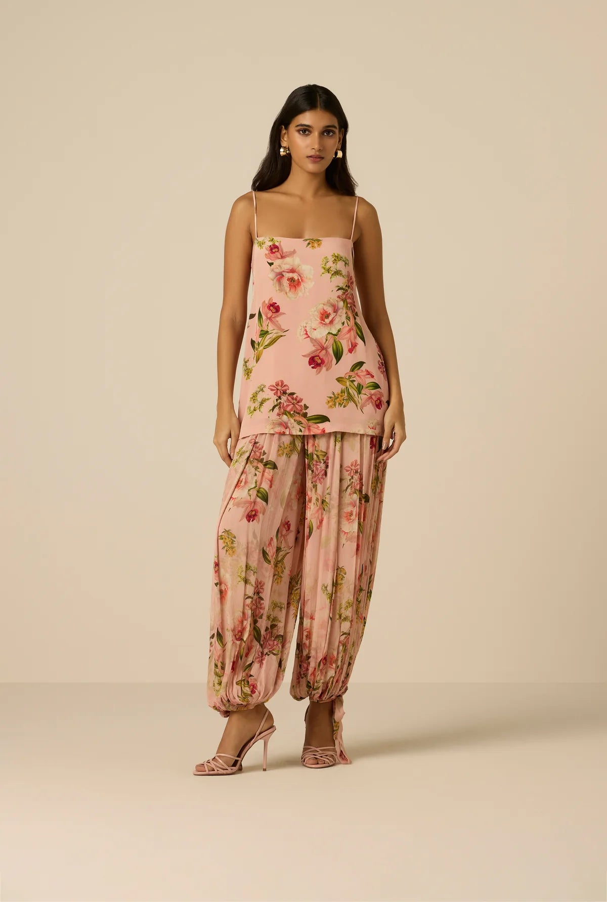 Playful florals and fluid movement define the Ayla Harem Pants from the Spring ’26 Collection. Crafted in peach viscose crinkle chiffon with a floral print, the relaxed mid-waist silhouette is designed in an easy slip-on style for ease of wear. Fully lined for comfort and coverage, the airy texture and soft drape enhance their free-spirited yet polished feel.