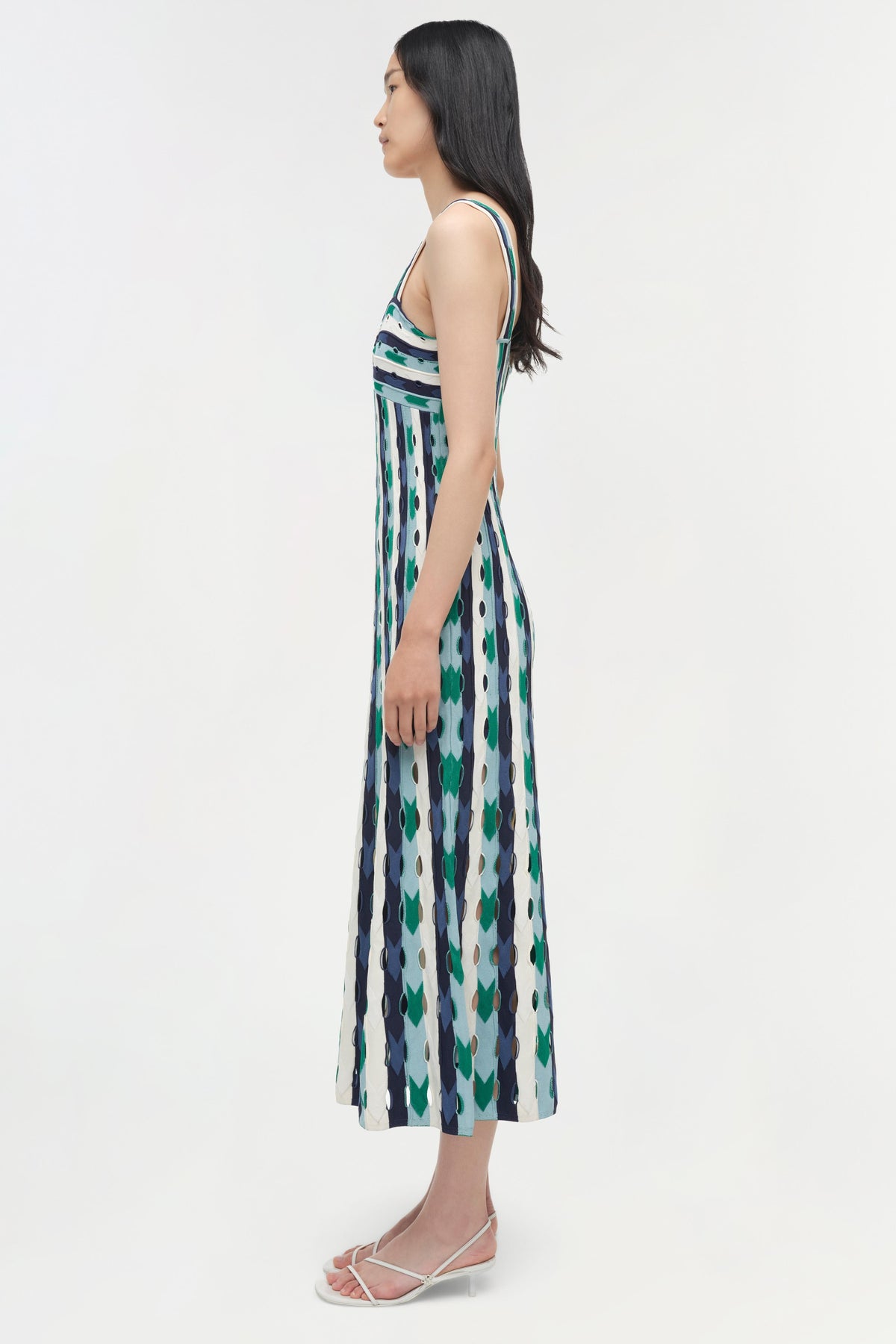 The Christina Knit Midi Dress in Kelly Green Multi. Constructed in compact eyelet knit, this midi dress contours the body with a soft vertical flow and releases into a gentle flare through the hem.