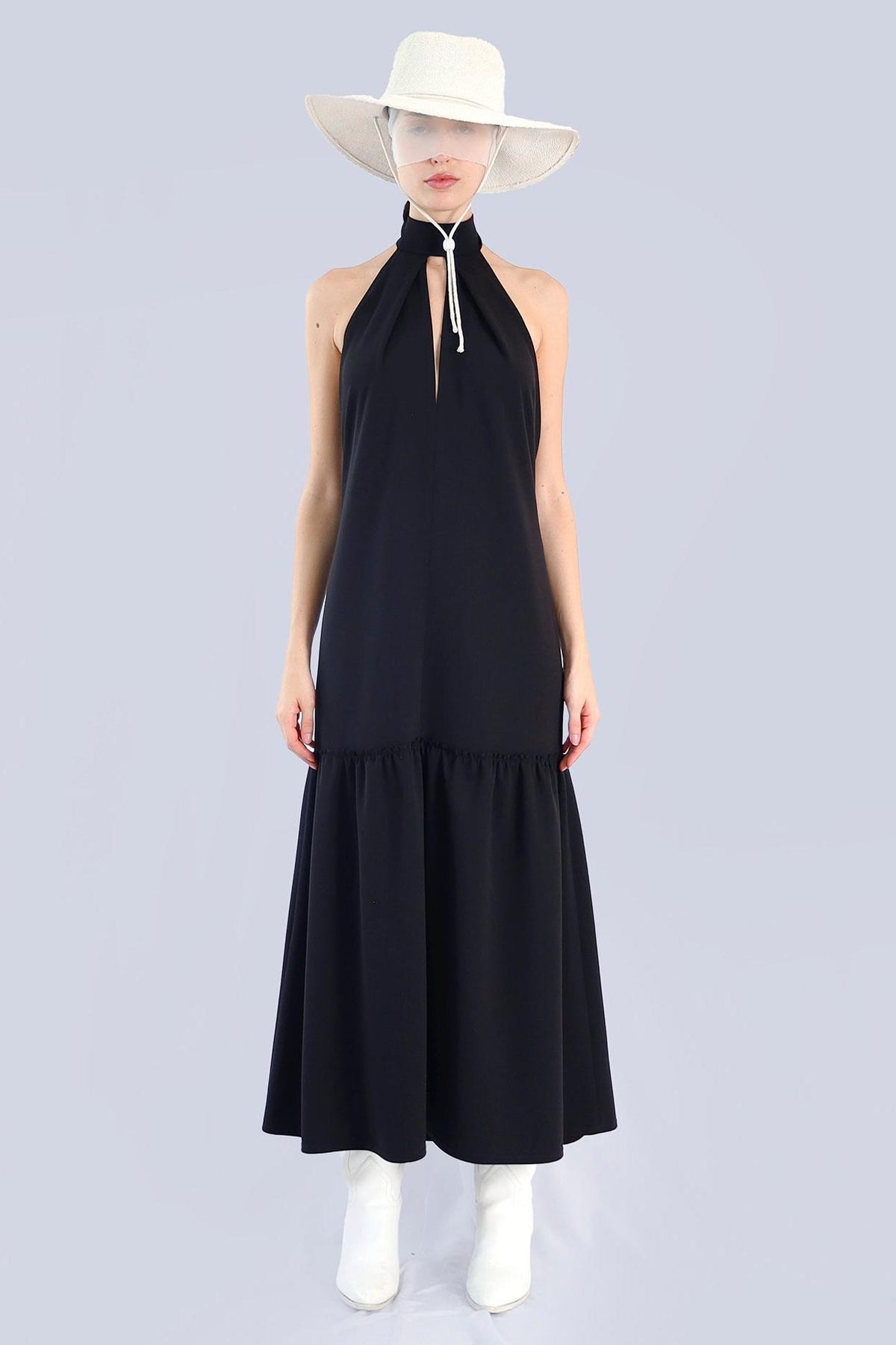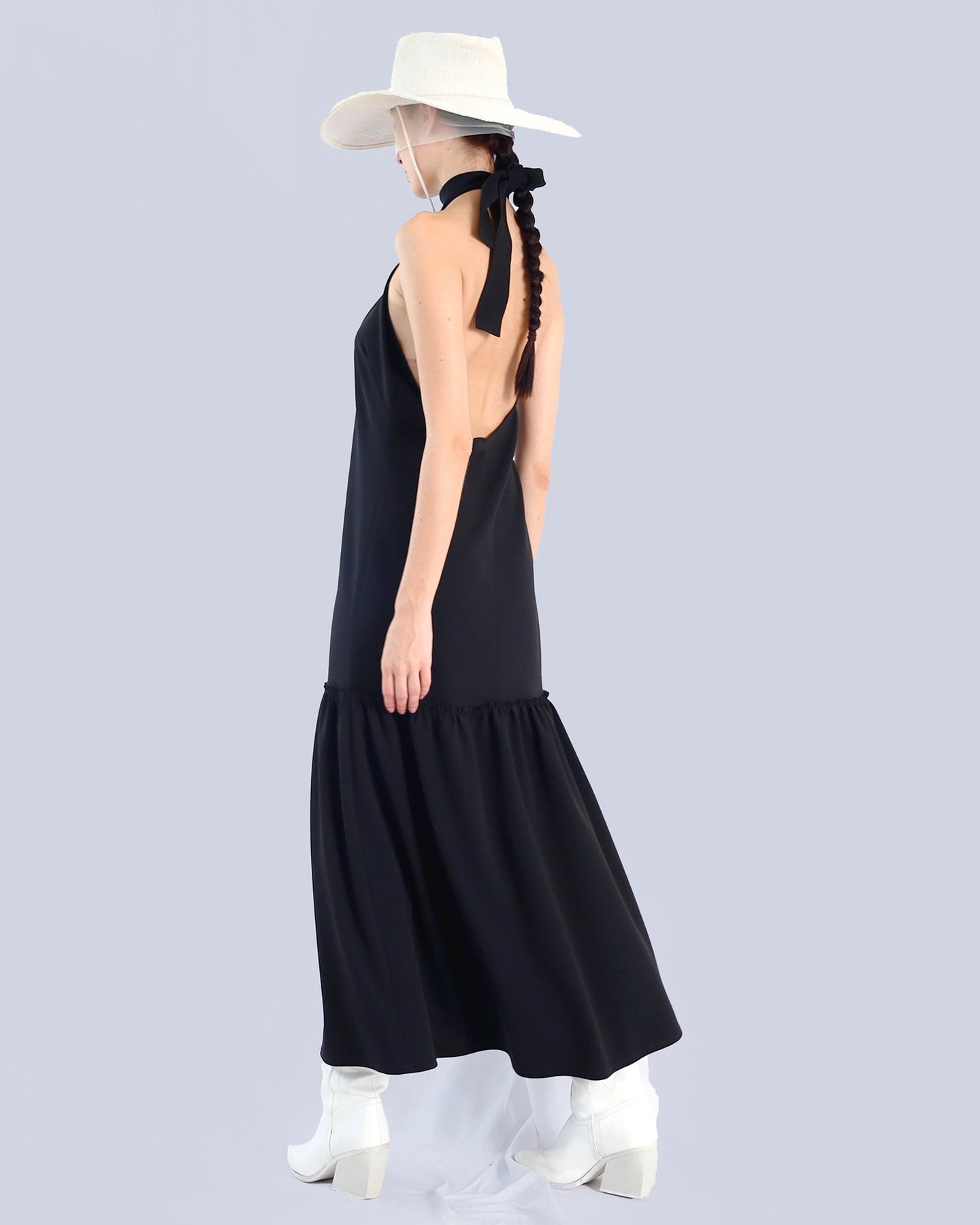 The Piat dress exudes effortless romance and elegance. Its halter design and deep keyhole neckline create a captivating silhouette, while the open back and large ruffle hem add movement and drama. Crafted in fluid crepe, Piat is a statement maxi dress that blends Maison Marie Saint Pierre’s signature sophistication with contemporary femininity.