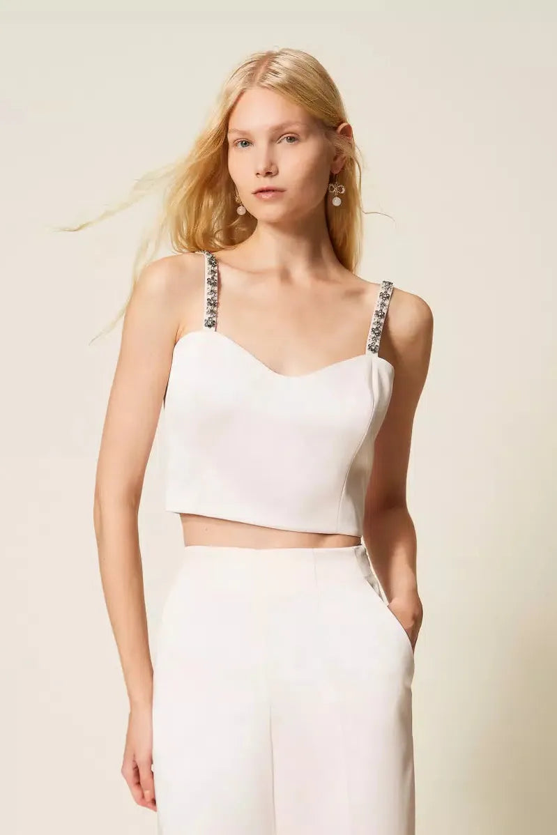 Duchesse cropped top with thin shoulder straps embroidered with bezels. Back zip fastening, lining, fitted. Perfect for parties and formal occasions.