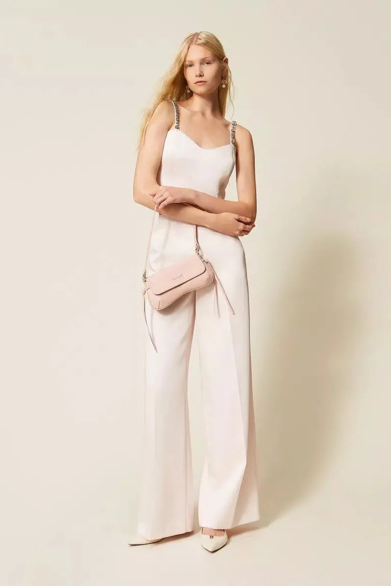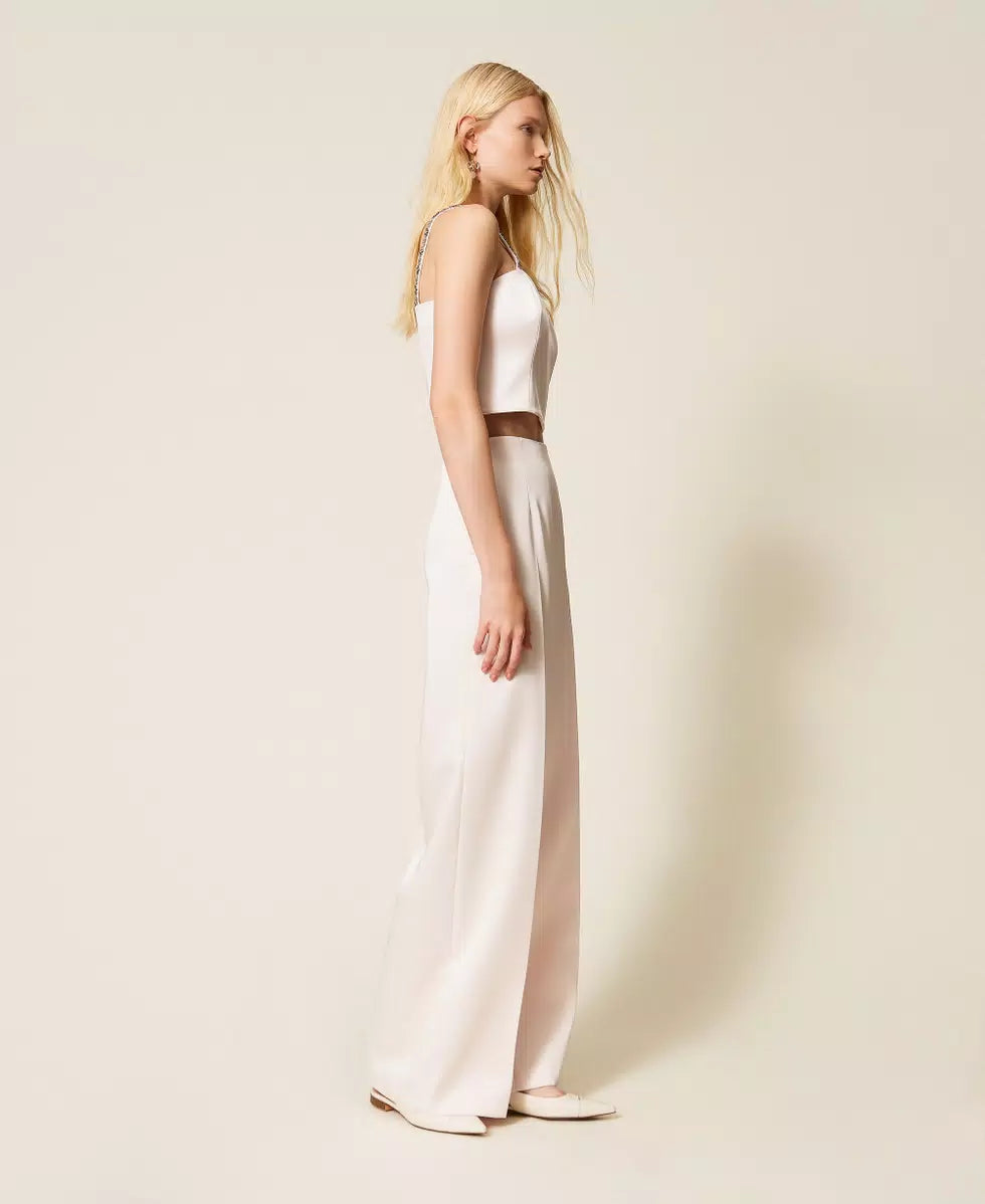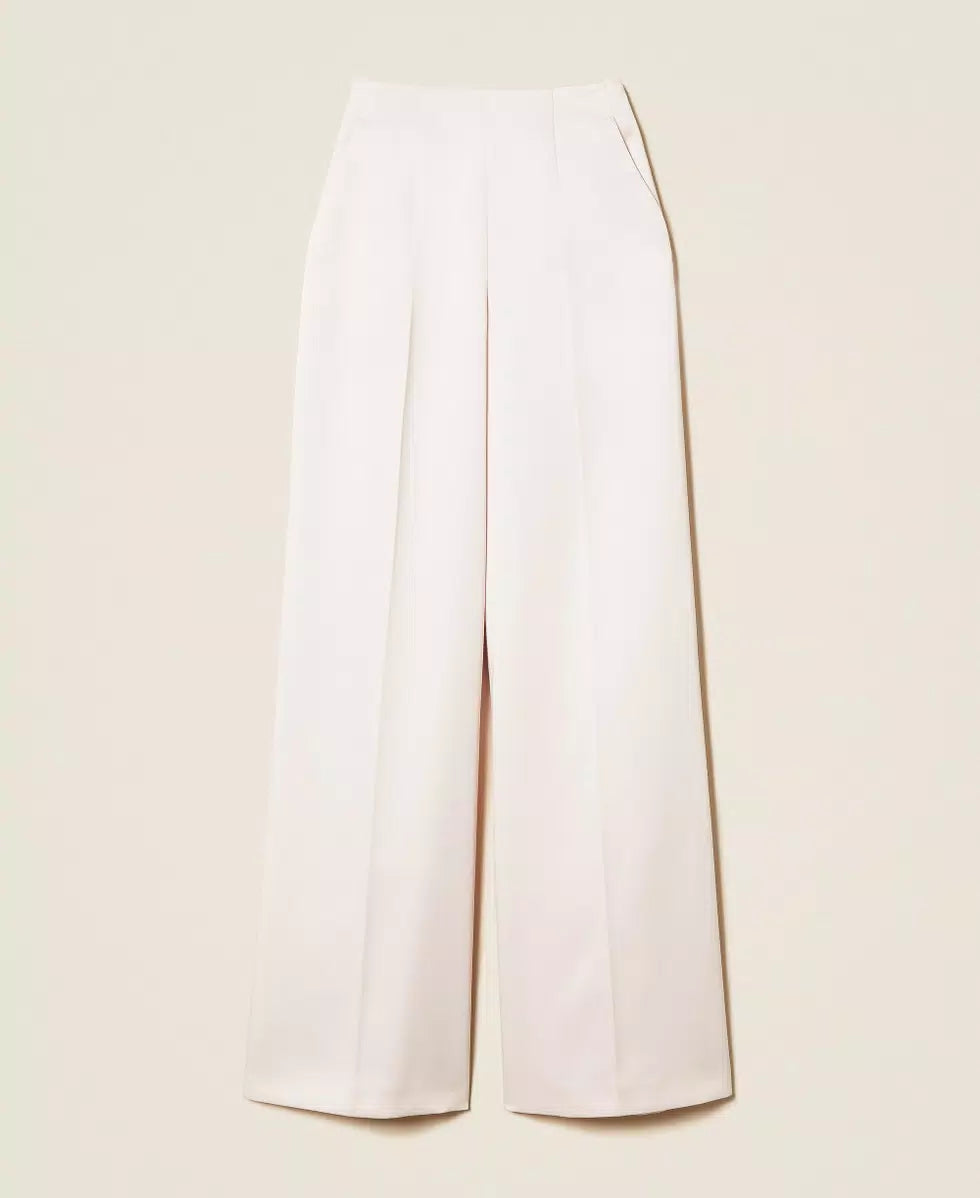 Duchess trousers with ironed in crease, side zip fastening, side pockets, palazzo fit. Perfect for parties and formal occasions.
