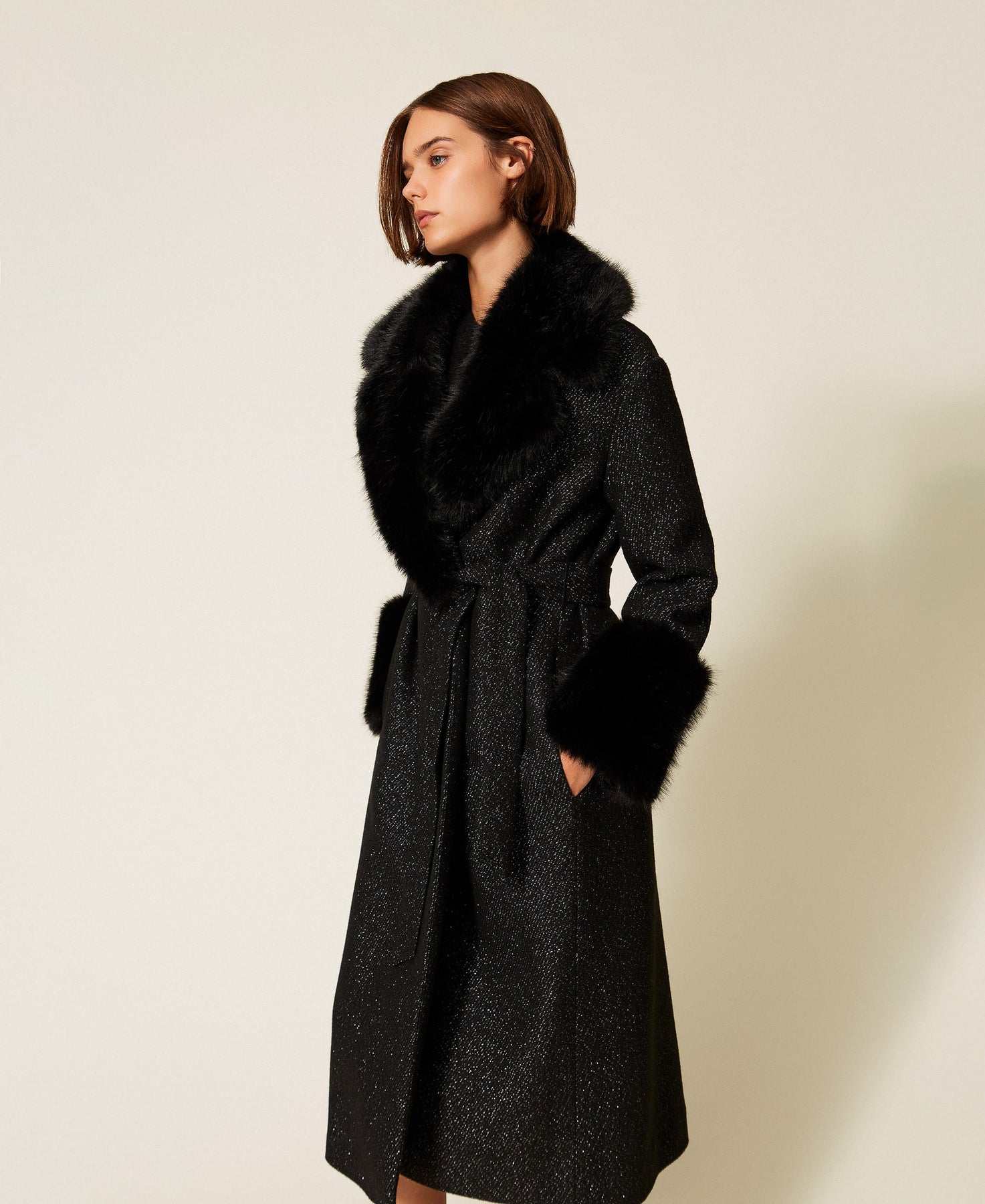 Long patterned wool cloth coat with lurex thread and removable faux fur collar and cuffs. Lapels, double-breasted button fastening, long sleeves, inset side pockets, central slit at the back, matching belt, quilted lining, Oval T logo plate at the back, straight fit.