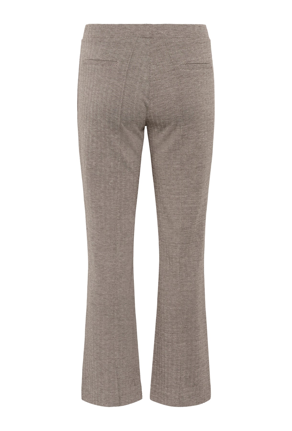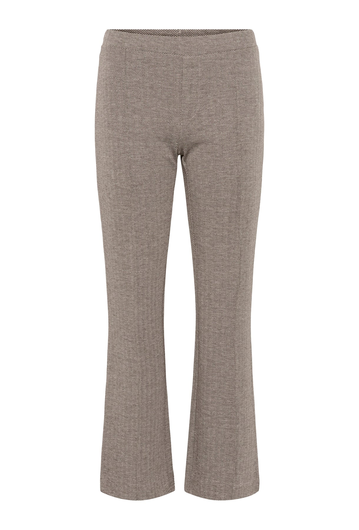 The model is 177 cm tall and wears a size 36. These trousers feature a timeless herringbone pattern with a straight-leg silhouette and comfortable elasticated waistband. The pressed front seams add a refined touch—ideal for both workwear and laid-back moments. Pair with a shirt or knit for a classic look.