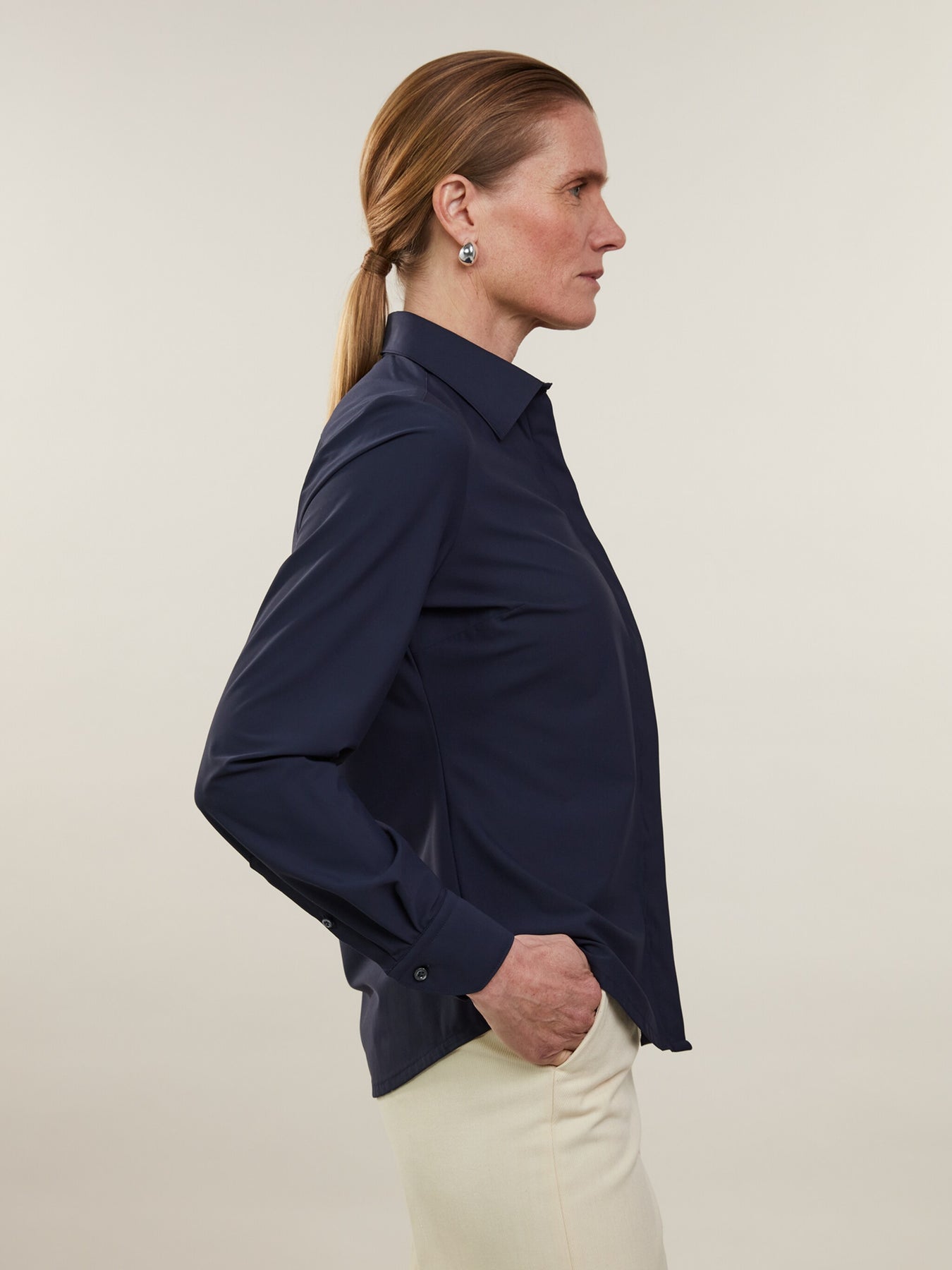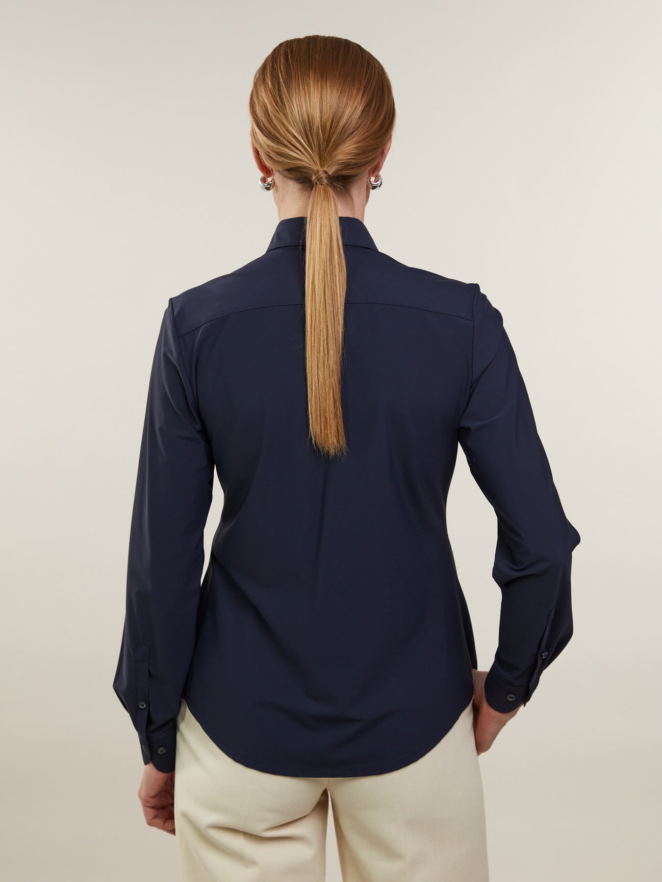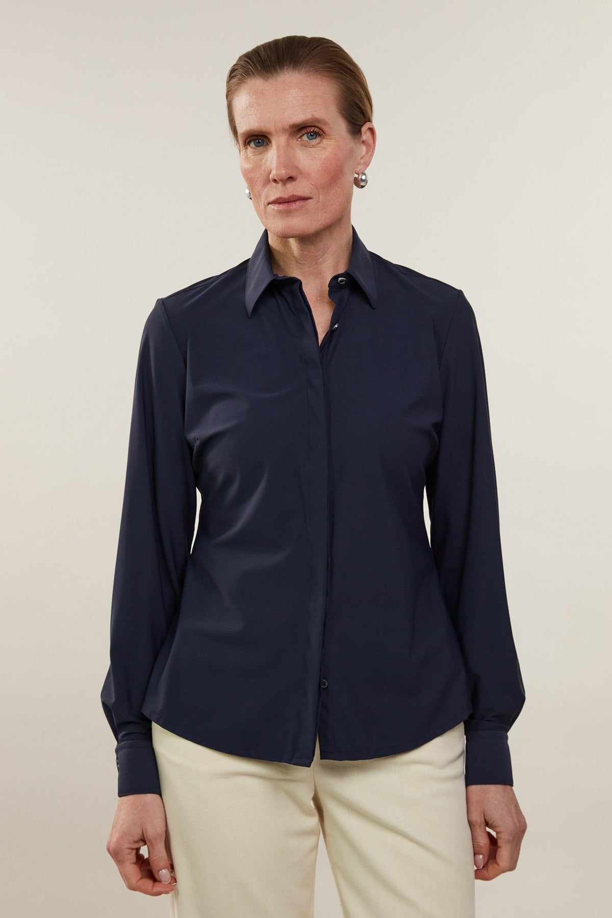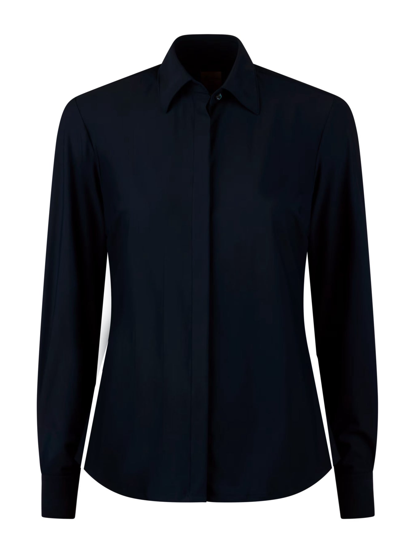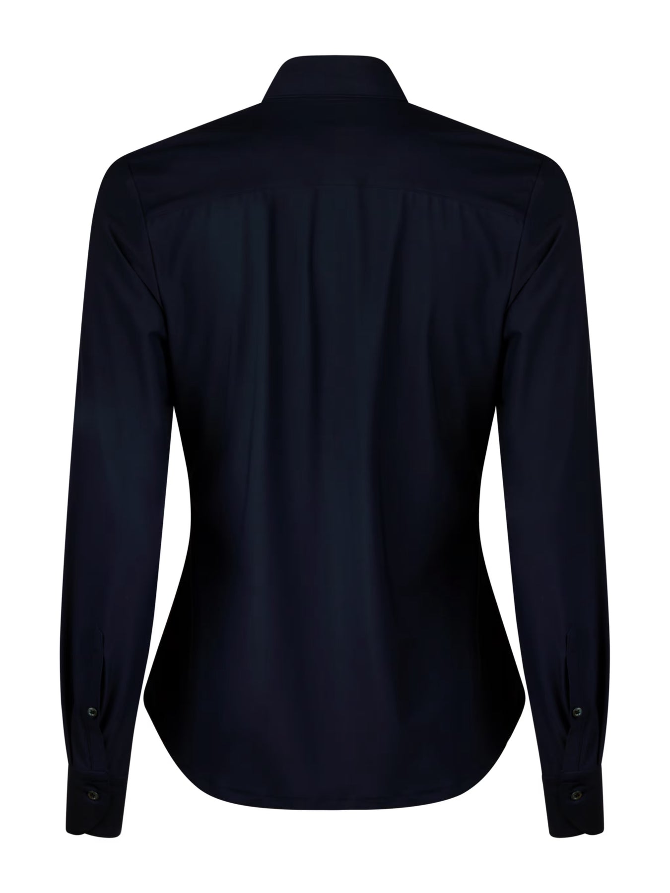This jersey shirt is made of polyamide and elastane and has a feminine fit. The shirt is detailed with mother of pearl buttons, single cuffs and a classic collar.